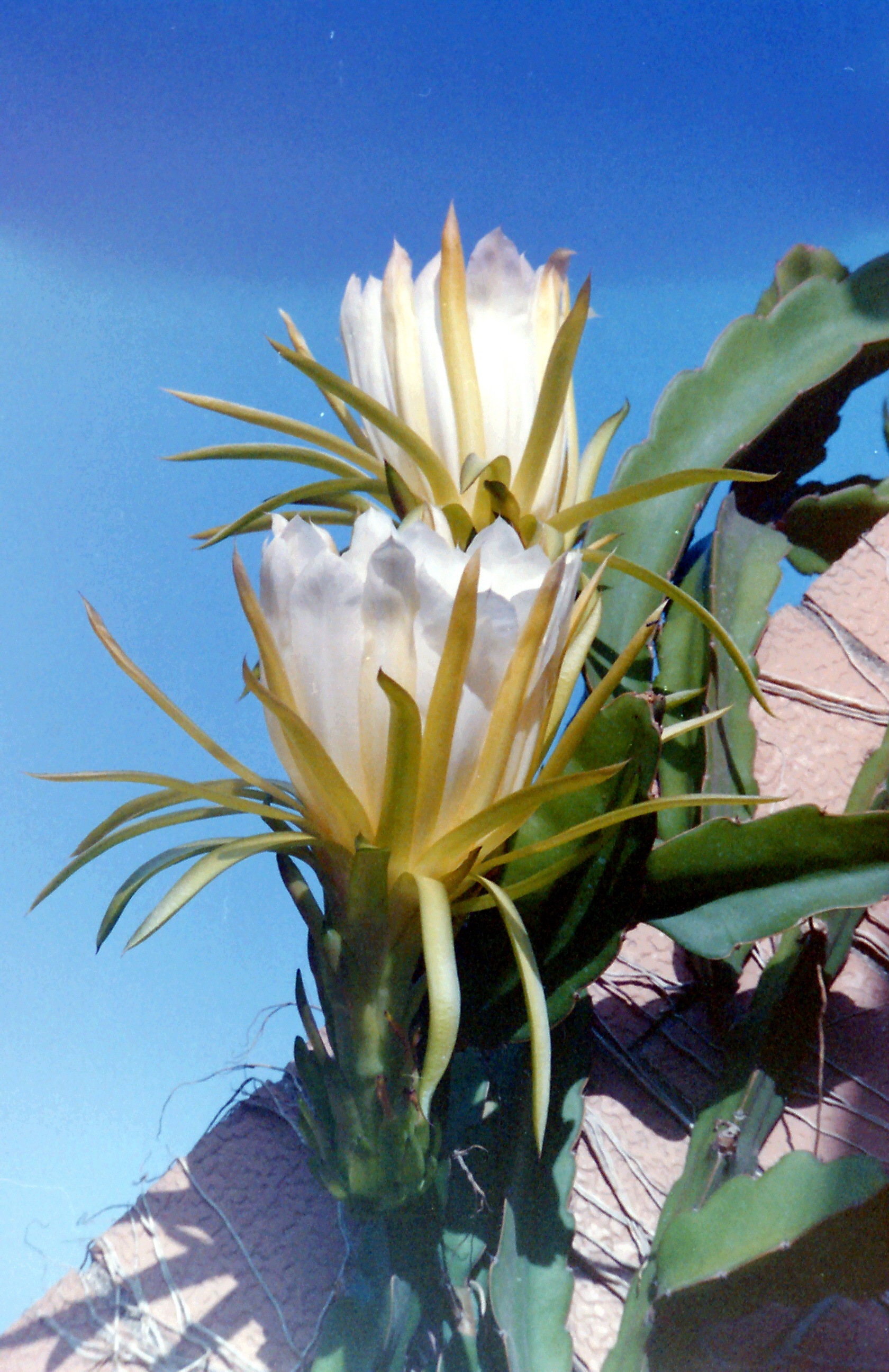 흰용과의 꽃은 향기가 나며 밤에 피고, 크고 화려하다. 꽃의 길이는 25cm, 너비는 15cm이다.[5] 자방은 길이가 2.5cm, 두께는 약 2.5cm이다. 포엽은 난형이며 뾰족하고, 길이는 2.5에서 4cm 미만이다. 꽃받침은 두께가 약 3cm이며, 포엽은 선형-피침형이고, 길이는 3cm이다. 바깥쪽 화피는 피침형-선형에서 선형이며, 뾰족하고, 길이는 10cm, 너비는 10mm이고, 끝이 짧고 뾰족하다. 색상은 녹황색 또는 흰색이며, 드물게 분홍빛을 띤다. 바깥쪽 화피, 즉 꽃받침조각은 약 65개이며, 꽃의 전체 너비는 최대 35cm에 이른다.[5] 안쪽 화피는 피침형(끝이 뾰족함)에서 도피침형(기부가 더 뾰족함)이며, 길이가 최대 10cm이고, 가장 넓은 부분의 너비는 약 40mm이며, 끝이 뾰족하고, 꺾이지 않고, 날카롭거나 뾰족하며, 흰색이다.수술은 길이가 5cm이고, 기울어져 있으며, 자방 위 35mm에서 목구멍까지 한 줄로 삽입되어 있으며, 크림색이다. 암술머리를 지지하는 암술은 17개까지 있으며, 길이는 5cm이고, 튼튼하며, 두께는 6mm이며, 크림색이다. 암술머리 엽은 최대 26개이며, 전체적이거나 때로는 상단이 갈라져 있으며, 크림색이고, 길이는 약 25mm이다. 꿀샘은 길이가 30mm이다.[2]