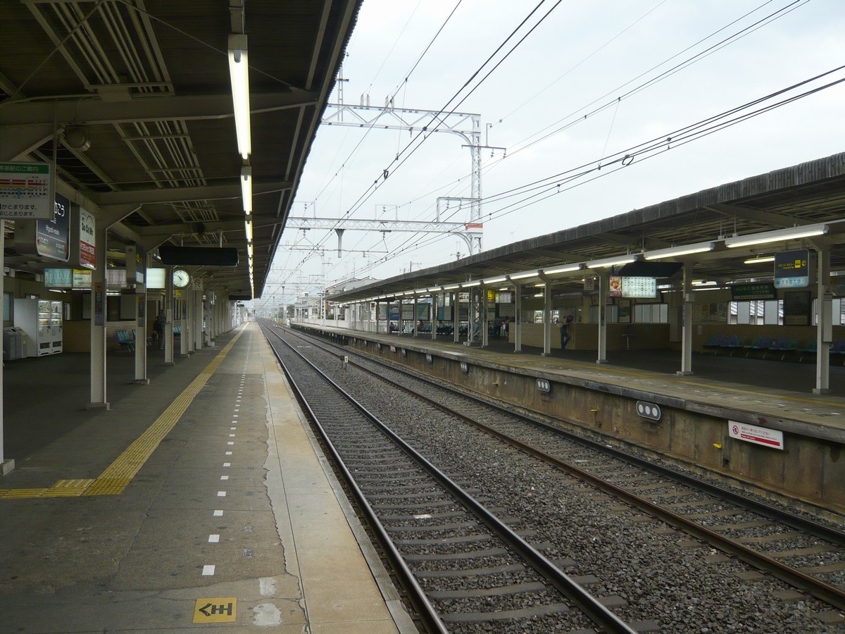 상대식 승강장 2면 2선을 갖춘 지상역이다. 분기기나 절대 신호기를 갖추지 않아 정류장으로 분류된다.[1] 역사는 양쪽 승강장의 우메다 방면에 있으며, 양쪽 승강장은 지하도로 연결되어 있다.[1] 우메다 방면 승강장 측의 개찰구 (동쪽 출구)는 무인이지만, 자동 발매기는 설치되어 있다.[1] 경륜 개최를 염두에 둔 탓인지, 승강장 폭이 넓고 자동 개찰기의 대수가 많다.[1]