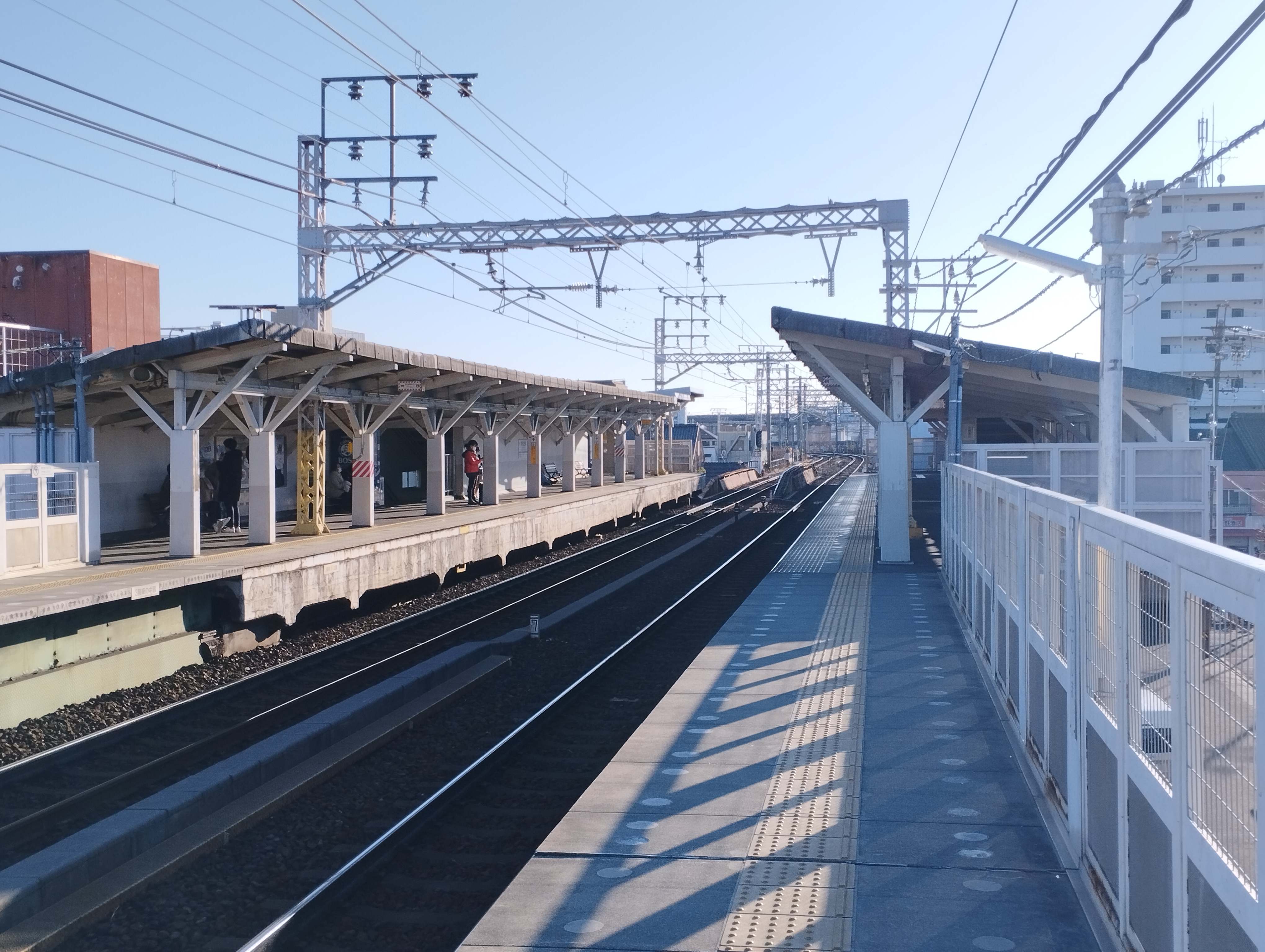 상대식 승강장 2면 2선의 고가역이다. 승강장 유효 길이는 6량 편성분으로, 8량 편성 열차는 뒤쪽 2량의 문을 열지 않는다. 역 전후로 S자형 급커브가 있어 통과 열차의 속도는 50km 정도로 제한된다. 승강장 지붕 기둥은 목재의 밝은 색으로 재도색되었다.[12]