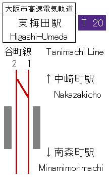 오사카시 교통국 히가시우메다 역은 지하 2층에 섬식 승강장 2면 2선 구조를 갖추고 있다. 각 승강장 북쪽 출구에 개찰구가 2개, 중앙에 승하차용 개찰구 2개, 남쪽에 양쪽 승강장 공용 개찰구가 1개 있다.