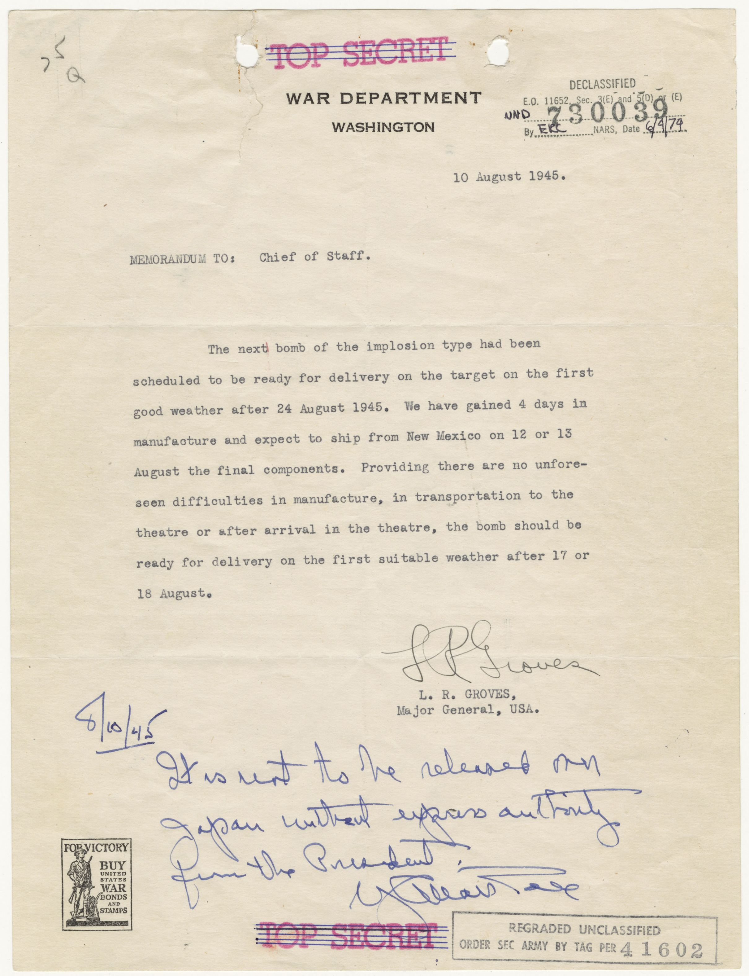 1945년 7월 25일, 맨해튼 계획의 최고 책임자 그로브스가 기초한 원폭 투하 지령서가 핸디 육군 참모총장 대리가 스파츠 육군 전략항공군 사령관에게 발령되는 동시에, 그로브스에 따르면 대통령의 공식적인 승인을 얻기 위해 포츠담으로 보내졌다고 한다.[222] 여기서 “'''히로시마'''·'''고쿠라'''·'''니가타'''·'''나가사키''' 중 어느 도시에 8월 3일경 이후 시계 폭격이 가능한 날씨의 날에 “특수 폭탄”을 투하한다”라고 명시되었다.[216][217][220]