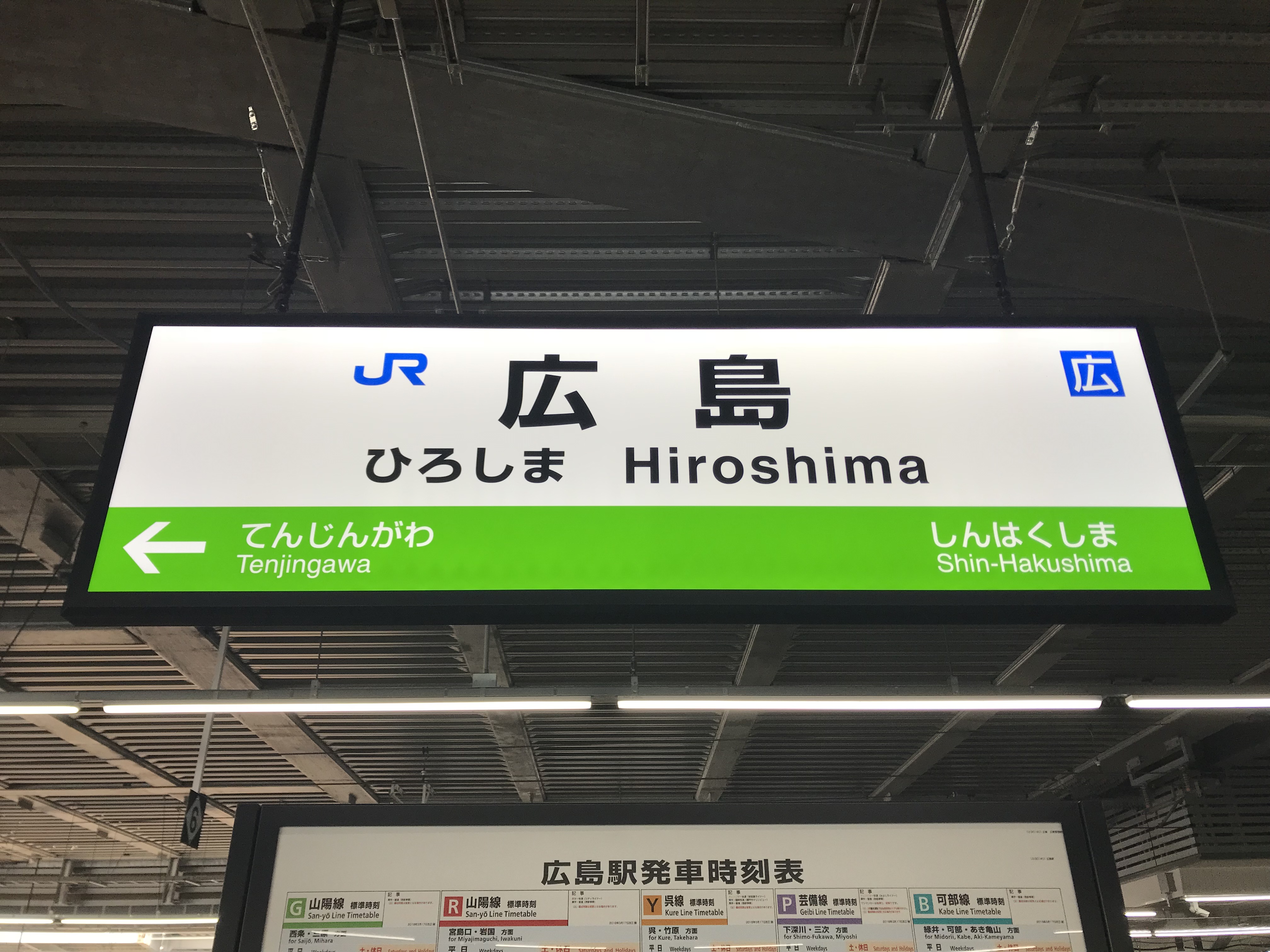 히로시마 역 승강장 표지판 (덴진가와 역과 신하쿠시마 역 사이)