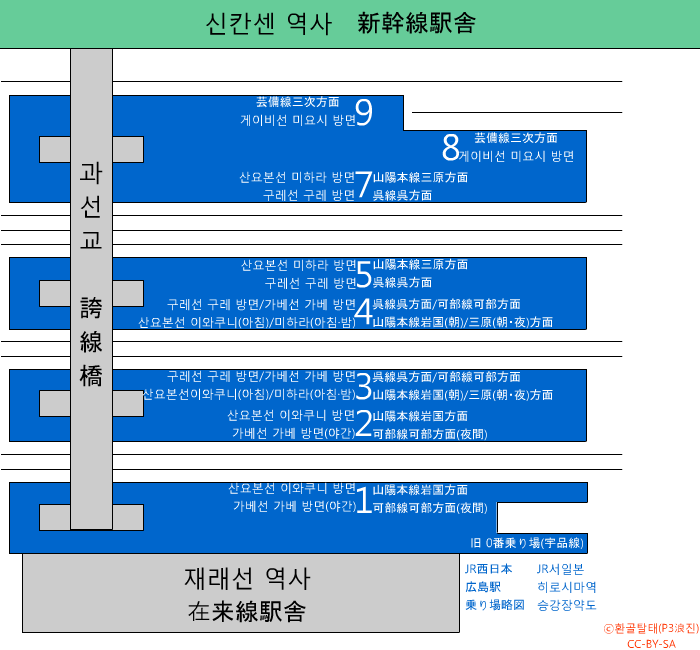 승강장은 기본적으로 위와 같지만, 산요 본선 이와쿠니 방면은 1번 승강장, 산요 본선 사이조 방면은 5번 승강장, 구레선은 3, 7번 승강장, 가베선은 4번 승강장, 게이비선은 9번 승강장에서 발차하는 경우가 많다(2번 승강장은 이 역 종착 후 입고하는 구레선 열차의 하차용으로 사용되는 경우가 많다). 화물 열차는 기본적으로 상행이 4번선이나 5번선, 하행이 2번선을 통과한다(여객 열차의 통과도 마찬가지이다).