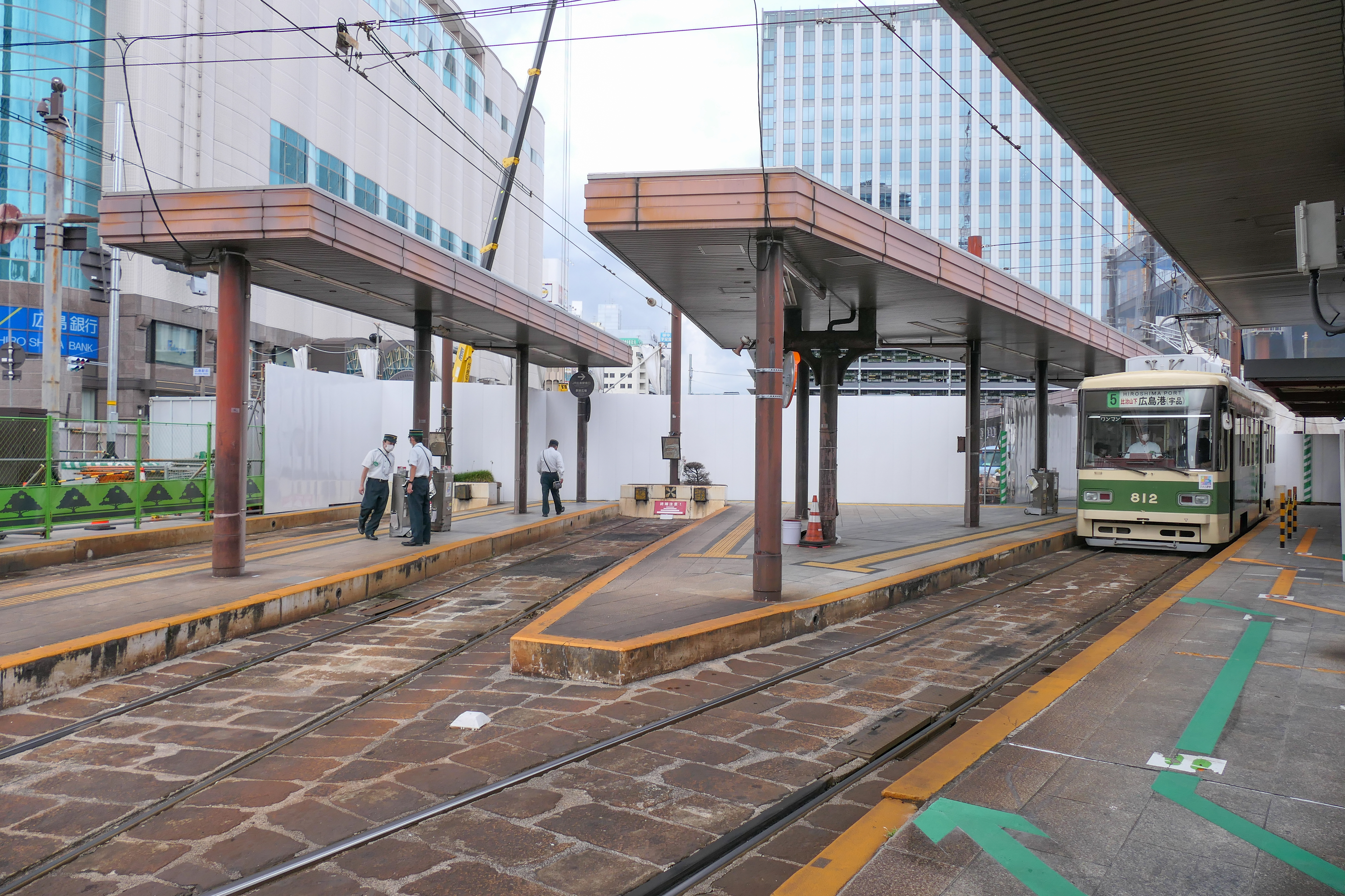 승차 승강장은 남쪽 출구 역사에 가장 가까운 북쪽 끝의 1면을 사용한다. 마쓰야마 항(松山港) 등으로 가는 항로가 취항하고 있는 히로시마 항으로 가려면 1호선(카미야초 동 경유)보다 5호선(히지야마시타 경유)이 소요 시간이 짧다[70]는 점도 있어, 동쪽을 1·2·6호선(하지초·카미야초 방면) 승강장으로, 서쪽을 5호선(히지야마 선) 전용 승강장으로 나누고 있다[71]. 1·2·6호선 승강장 앞에는 안내소(히로시마 전철(広島電鉄) 히로시마역 정기권 창구)와 자동 환전기, PASPY 충전기가 설치되어 있으며, 승객이 많은 경우에는 직원이 승차 승강장에 나와 안내를 한다. 5호선 전차는 서쪽 승강장 출발 후, 1·2·6호선 승강장을 통과한다.