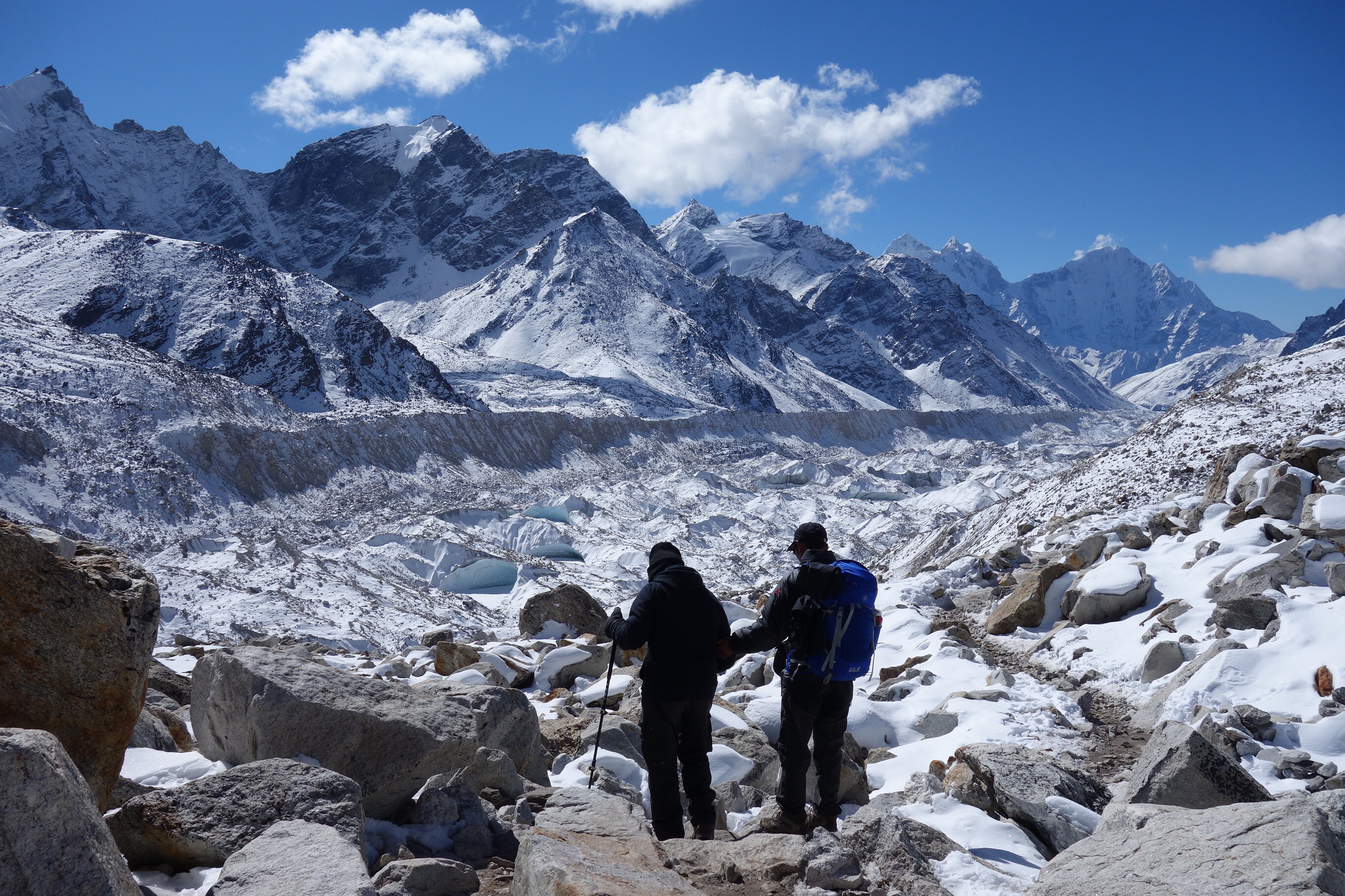 히말라야 산맥과 중앙아시아 산맥에는 남극과 북극 지역 다음으로 세계에서 세 번째로 큰 빙하와 눈이 저장되어 있다.[38] 약 1만 5천 개의 빙하를 포함하고 있으며, 약 12,000㎦의 담수를 저장하고 있어 종종 "제3극"이라고 불린다.[39][40] 에베레스트산 지역의 사우스 콜 빙하와 쿰부 빙하는 세계에서 가장 높은 빙하 중 하나이다.[41] 길이가 32㎞에 달하는 갠지스강의 주요 수원 중 하나인 강고트리 빙하는 가장 큰 빙하 중 하나이다. 히말라야 빙하는 하강 속도에 상당한 차이를 보인다. 쿰부 빙하는 하루에 약 약 0.30m 정도 이동하는 반면, 다른 빙하는 하루에 약 약 1.83m 정도 이동한다.[42]