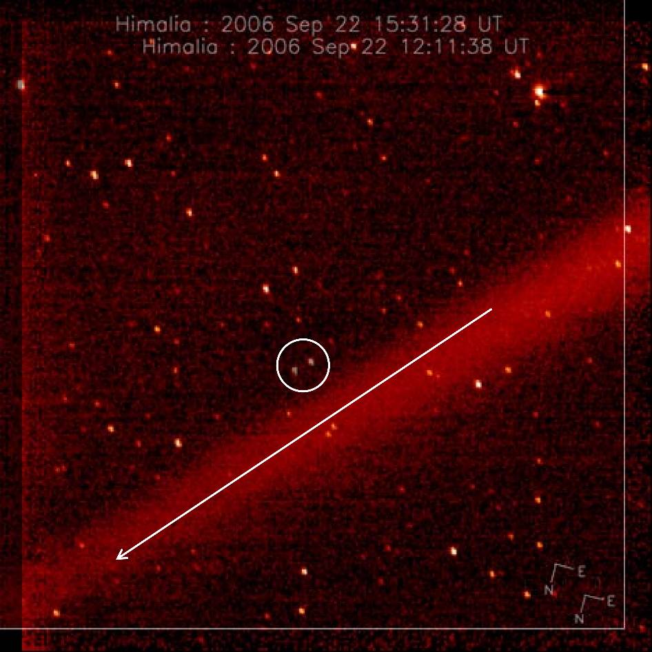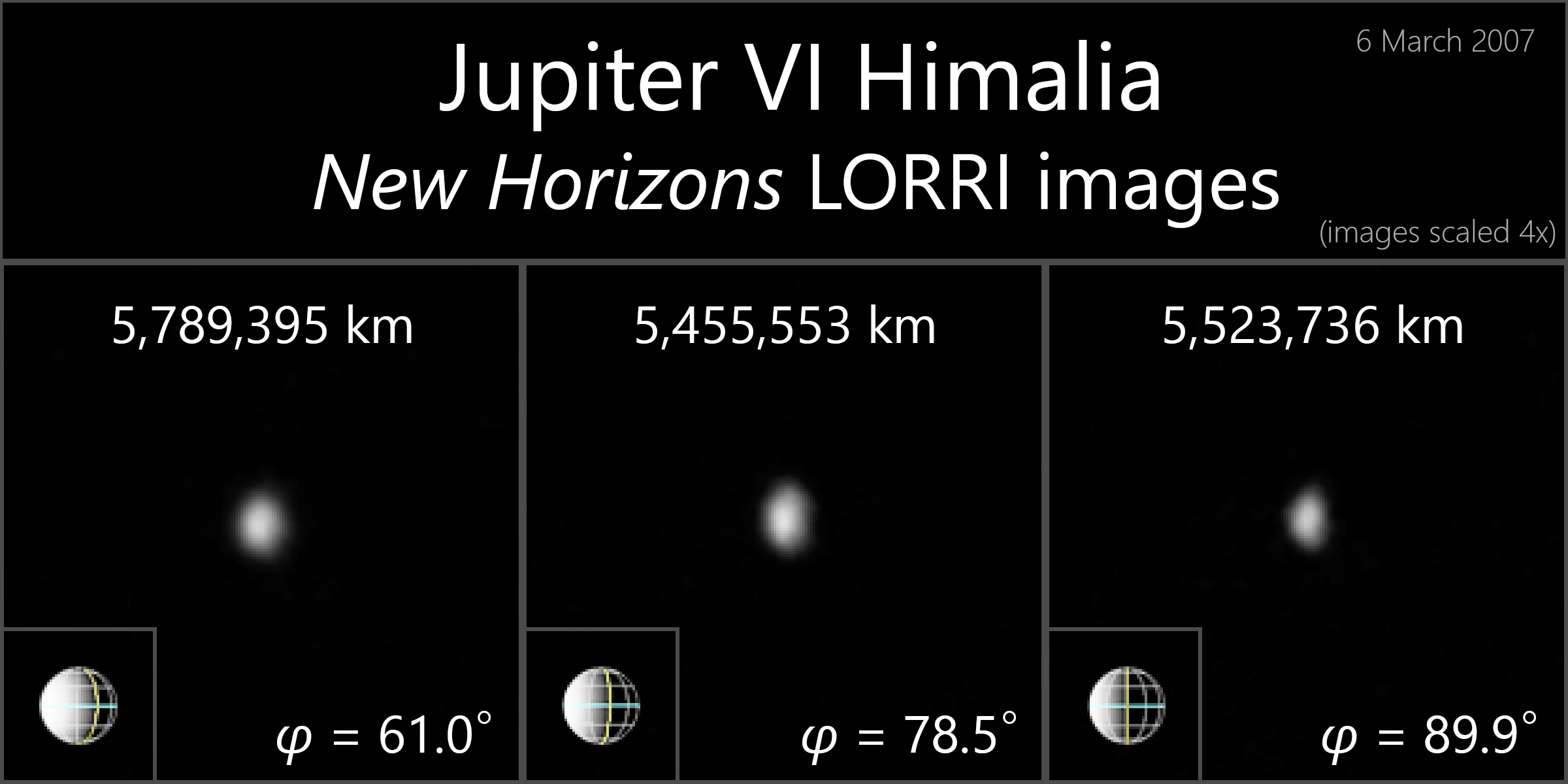 2007년 2월과 3월에 명왕성으로 향하던 뉴 허라이즌스 호가 8백만 킬로미터 거리에서 히말리아의 사진을 촬영했다. 뉴 허라이즌스 호의 사진에 나타난 히말리아는 수 픽셀 정도의 크기였다.[19] 2007년 3월 7일에도 뉴 호라이즌스가 명왕성으로 가는 도중 목성 관측의 일환으로 히말리아를 촬영했지만, 이 역시 거리가 멀어 불과 수 픽셀의 이미지로 그쳤다.[36]5. 3. 히말리아 고리(Himalia ring)
