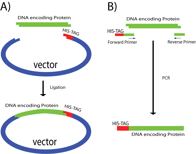 His-tag를 단백질 유전자에 추가하는 주된 방법에는 두 가지가 있다.