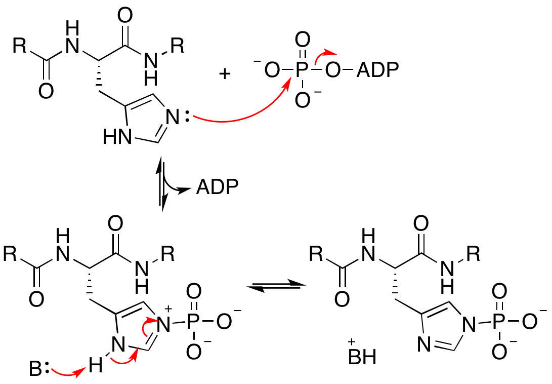 ATP 결합 시 CA 도메인이 회전하여 다른 단량체의 DHp와 접촉하고, 보존된 His-260이 γ 인산 근처에 위치하게 된다. His-260의 Nε가 친핵성 첨가에서 ATP의 γ 인산을 공격하여 ADP를 이탈기로 방출한다.[8]