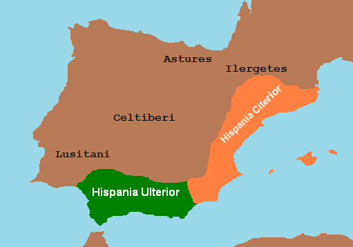 로마화 초기 단계에서 이베리아 반도는 행정 목적으로 로마인에 의해 두 부분으로 나뉘었다. 로마에 더 가까운 지역은 키테리오르(Citerior)라 불렸고, 더 먼 지역은 울테리오르(Ulterior)라 불렸다. 두 지역 사이의 경계는 카르타고 노바(현재 카르타헤나)에서 칸타브리아 해까지 이어지는 구불구불한 선이었다.[13]- 히스파니아 울테리오르 (현재의 안달루시아, 포르투갈, 에스트레마두라, 레온, 이전 카스티야 라 비에하의 대부분, 갈리시아, 아스투리아스, 그리고 바스크 지방을 포함)