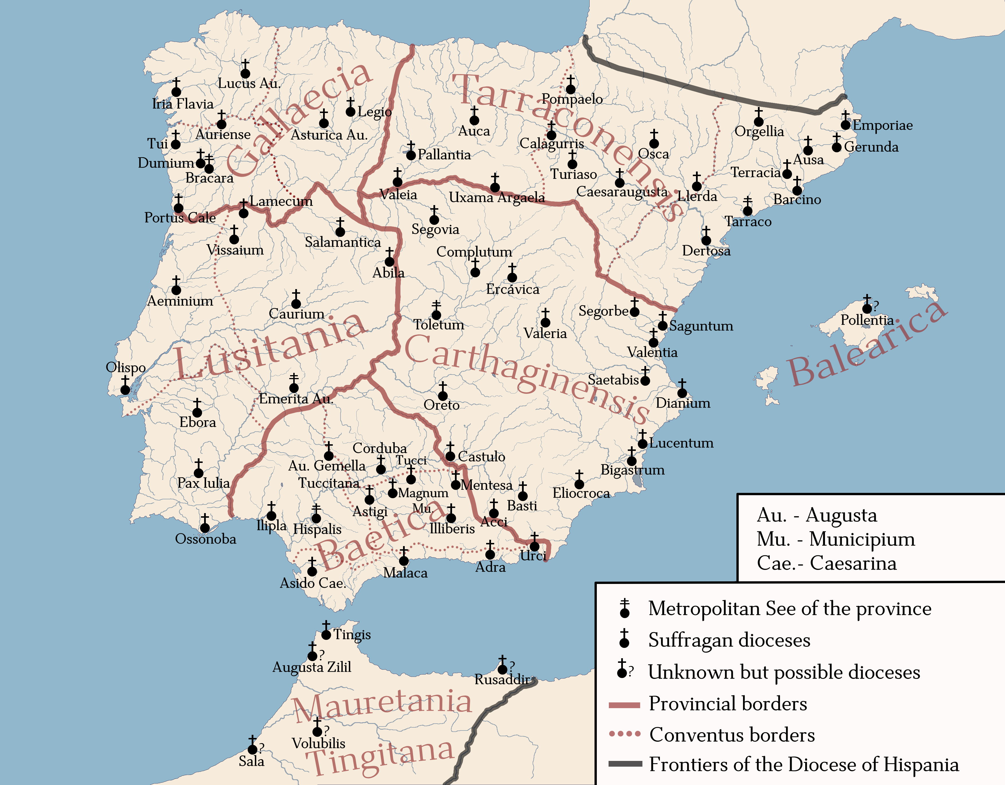 서기 293년 디오클레티아누스의 테트라르키아 개혁 이후 새로운 ''히스파니아 교구''는 ''비카리우스''에 의해 통치되는 네 개의 교구 중 하나가 되었다.[13] (또한 갈리아, 게르마니아, 브리타니아의 주를 포함) 서로마 황제(나중에 라벤나에 있는 로마) 치하에서 황제 테트라르크가 폐지된 후였다. 에메리타 아우구스타(현대 메리다)를 수도로 하는 이 교구는 다음을 포함하였다.