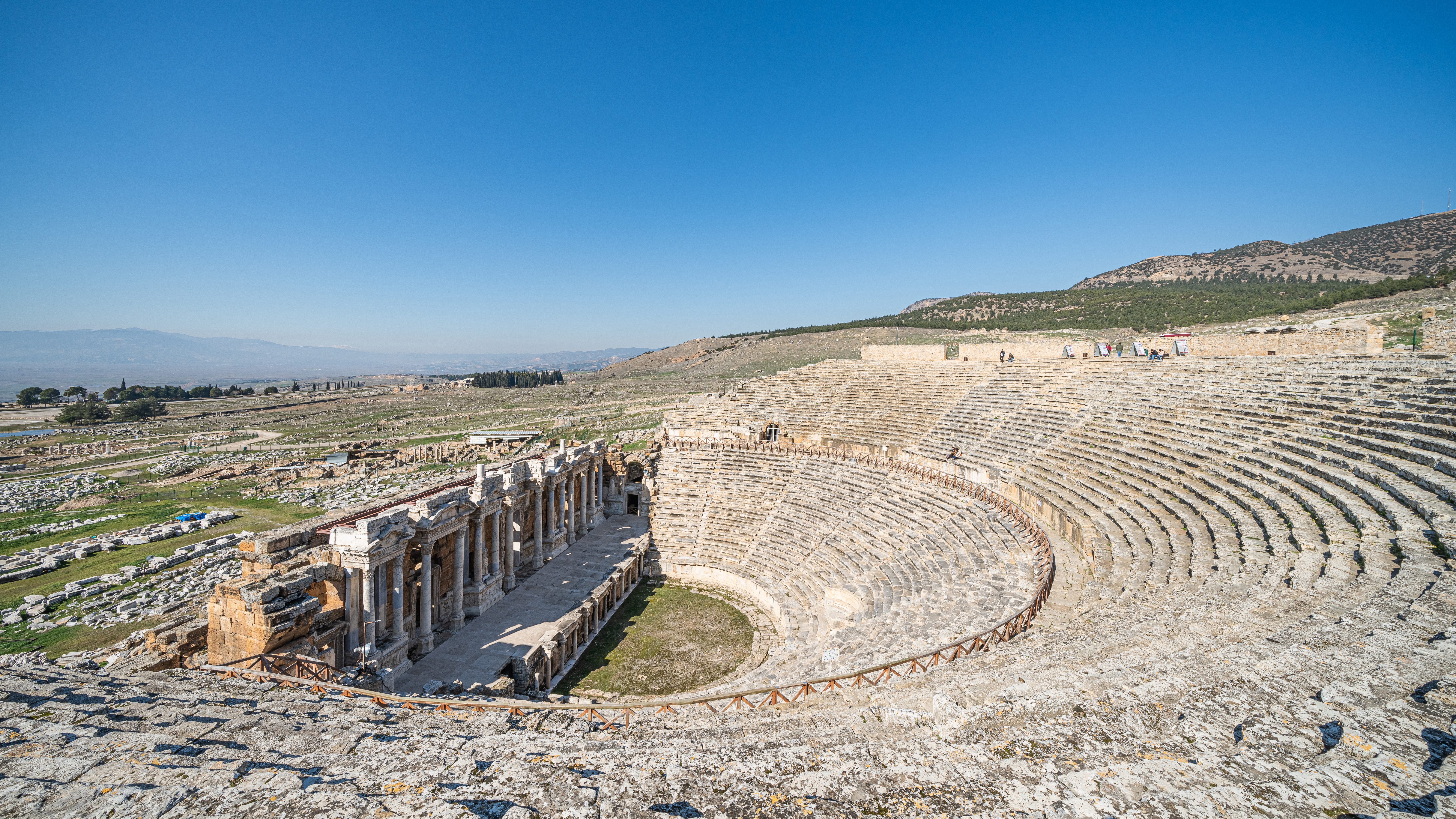 히에라폴리스의 극장은 기원후 60년 지진 이후 하드리아누스 황제 통치 시기에 건설된 것으로 추정된다.[19] 정면의 길이는 약 91m이며, 상당 부분이 현재까지 남아 있다. 관객석은 50열의 좌석이 8개의 중간 계단으로 7개 구역으로 나뉘어 있고, 중앙 통로(diazoma)는 두 개의 아치형 통로(vomitoria)를 통해 출입할 수 있었다. 관객석 중앙에는 황제석(Imperial loge)이 있고, 오케스트라 주위에는 높이 1.83m의 벽이 있다.