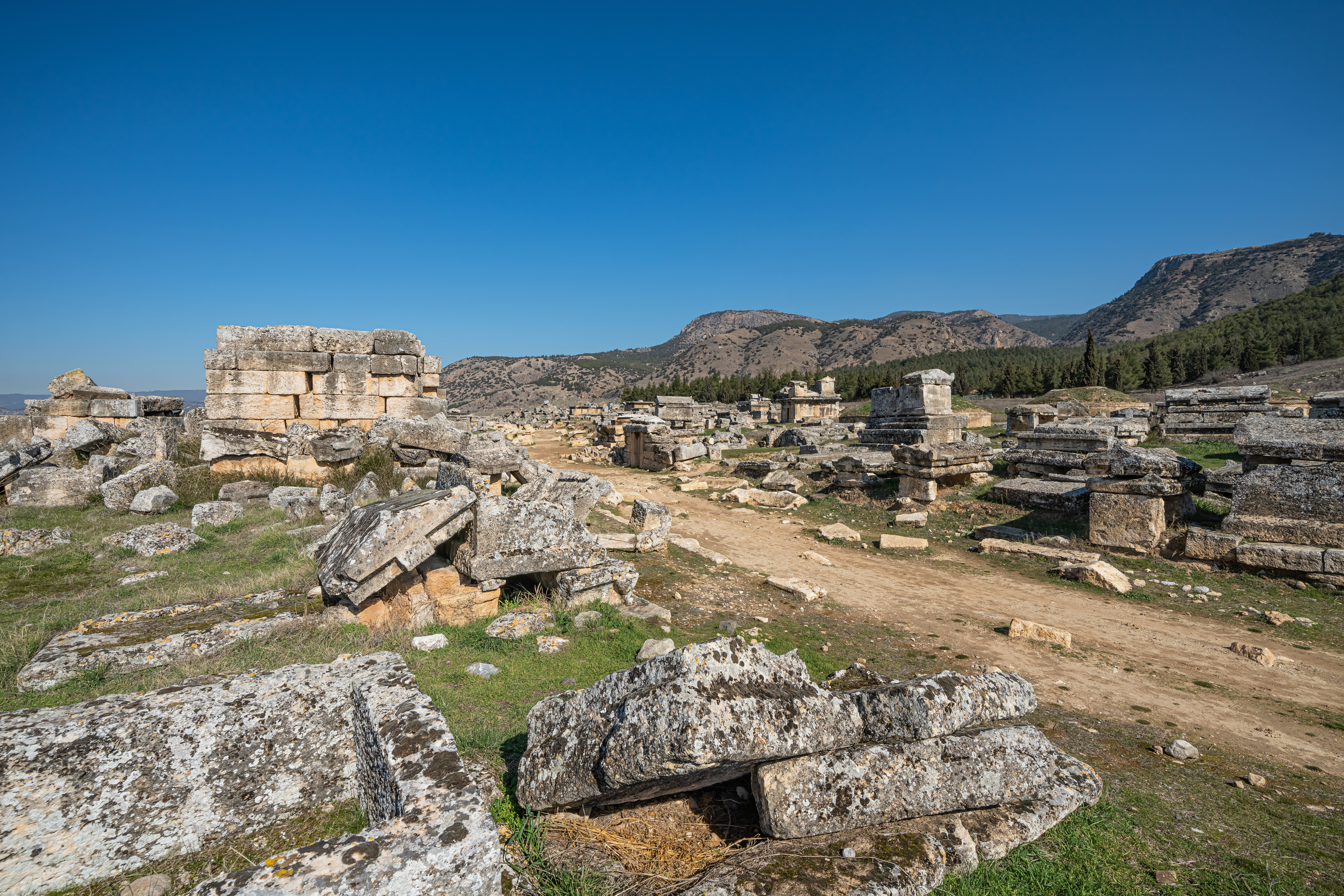 - 네크로폴리스: 도시 성벽 밖에 위치한 공동묘지로, 석관, 고분 등 다양한 형태의 무덤들이 있다.