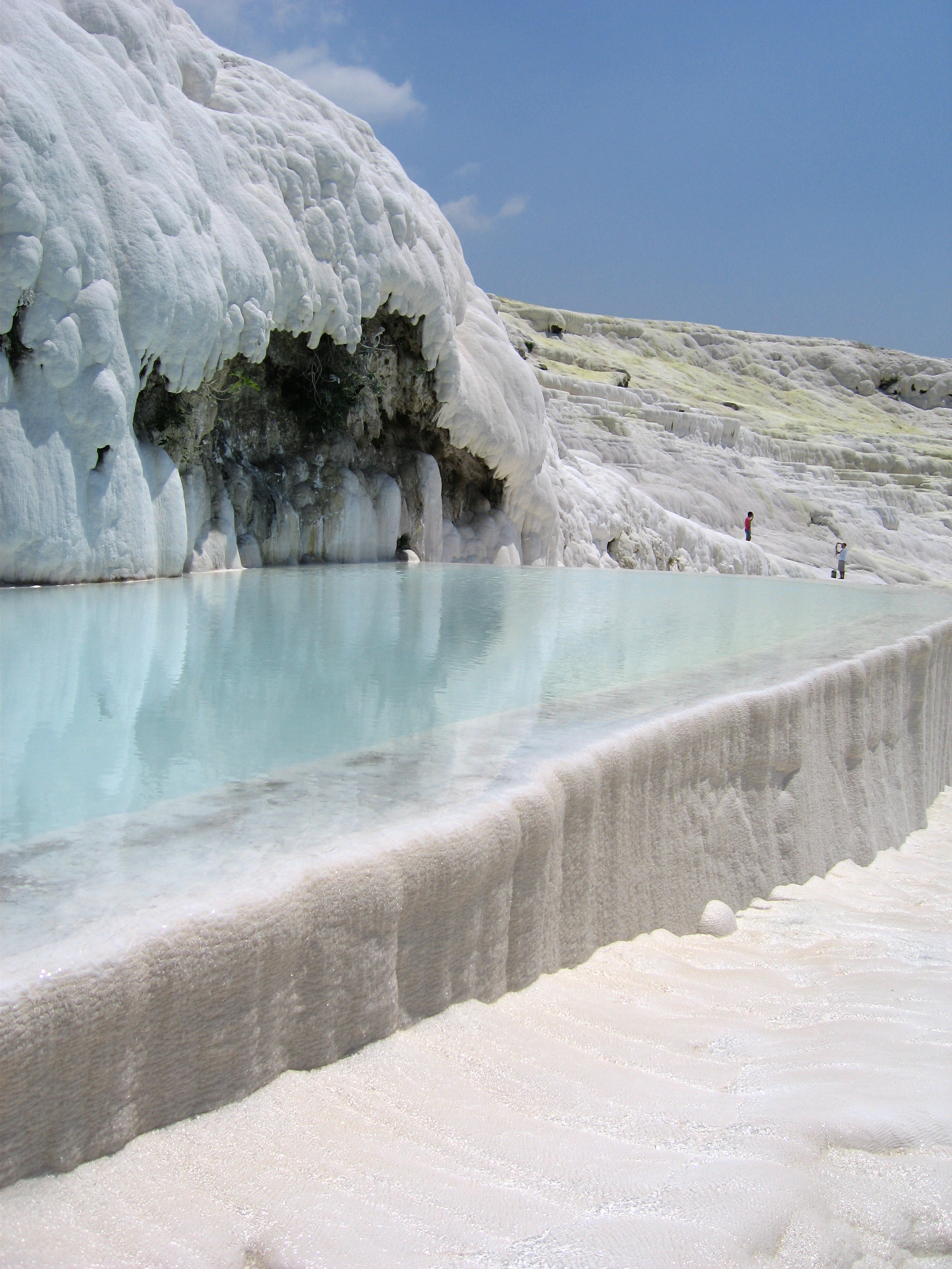 이산화탄소를 포함한 약산성의 빗물이 고원을 이루는 석회암에 스며들어 탄산칼슘을 녹인 지하수가 된다. 그 지하수가 지열로 데워져 지표면으로 솟아나 온천이 되고, 그 온천수에서 탄산칼슘(석회)이 침전되어 순백색의 논밭과 같은 경관을 만들어낸 것이다.