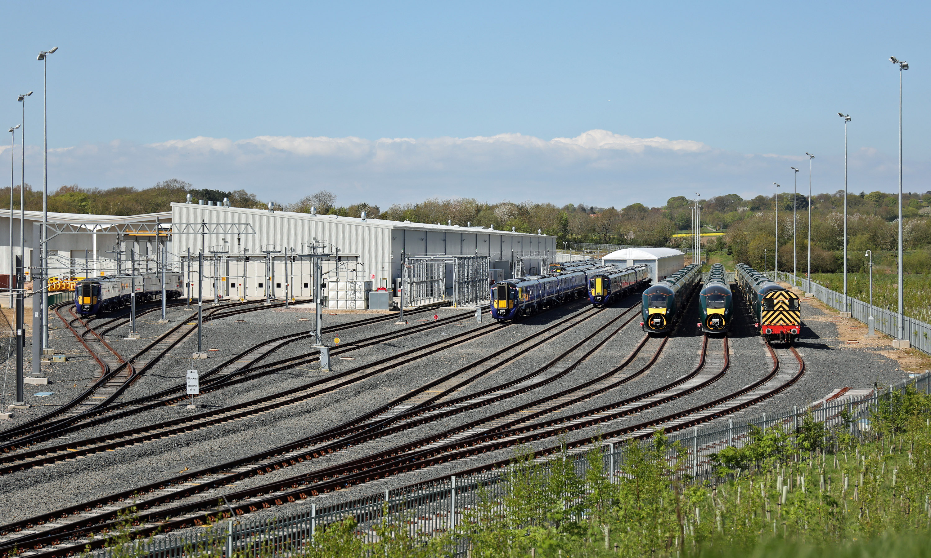 영국의 산업혁명과 철도 발상지인 잉글랜드 더럼주 뉴턴에이클리프 공장 외부에 정렬된 영국철도 385형(385형), 영국철도 800형(800/803형), 영국철도 08형 디젤 기관차(08)(입환 기관차)