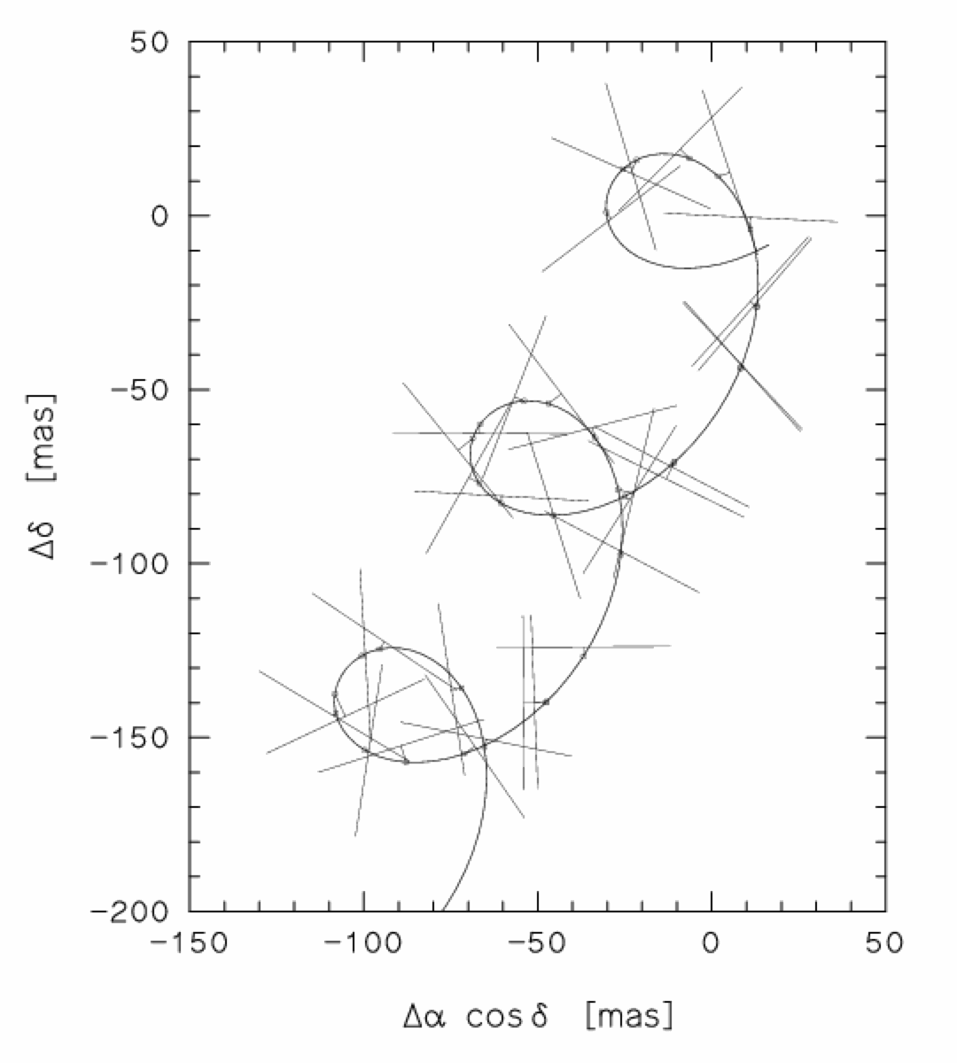 3년의 관측 기간 동안 각 별에 대한 다양한 기하학적 스캔 구성은 중심 좌표 방향, 시차, 고유 운동을 효과적으로 해결할 수 있는 조밀한 네트워크를 만들었다. 측량 매개변수뿐만 아니라 그 표준 오차 및 상관 계수도 이 과정에서 파생되었다.[7]