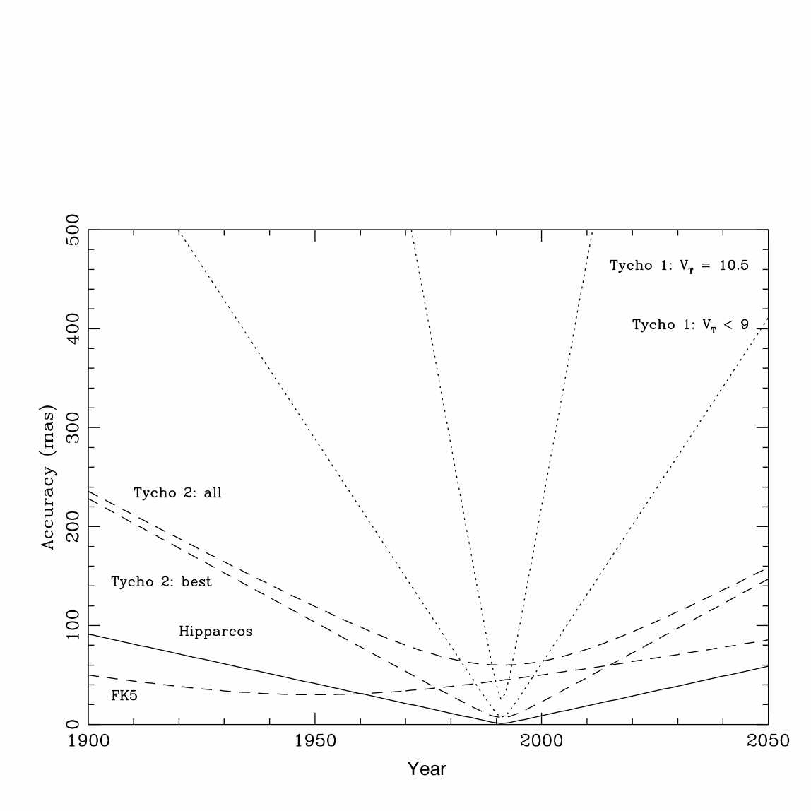 1997년 히파르코스 위성의 관측 결과를 바탕으로 히파르코스 목록과 티코 목록이 출판되었다.[16] 히파르코스 목록은 약 118,000개의 별에 대한 정밀한 위치, 연주시차, 고유 운동 정보를 담고 있으며, 평균 정밀도는 0.001 초각 수준이다. 티코 목록은 약 100만 개 이상의 별에 대한 위치와 2색(B 및 V 밴드) 광도 측정값을 제공한다.[15] 이후, 티코 목록은 더 많은 별의 데이터를 포함하는 티코-2 목록(약 250만 개)으로 확장되었다.[17]