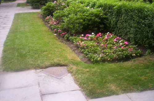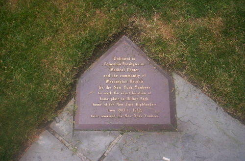 ''"1903년부터 1912년까지 뉴욕 하이랜더스, 이후 뉴욕 양키스로 개명된 힐탑 파크의 홈 플레이트 정확한 위치를 기념하기 위해 뉴욕 양키스가 컬럼비아-장로교 의료 센터와 워싱턴 하이츠 지역 사회에 헌정합니다."''