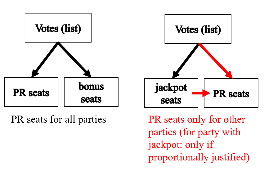 과반수 보너스 또는 잭팟을 사용하는 선거 제도는 "비전통 혼합 시스템"[17]으로 언급되어 왔으며, 이는 혼합식 다수 대표제 유형에 속하지만, 보상적(잭팟)이거나 비보상적(보너스)일 수 있다. 아르메니아, 그리스, 산마리노, 2006년부터 2013년까지의 이탈리아[18]에서 사용된 과반수 보너스는, 다수 득표 시스템과 유사한 원리로, 가장 인기 있는 정당 또는 연합이 소수 득표로 다수의 의석을 차지하도록 돕는다. 그러나 나머지 의석은 (때로는 야당에만) 분배되며, 경우에 따라 집권 연합 내에서 비례대표제가 사용된다.