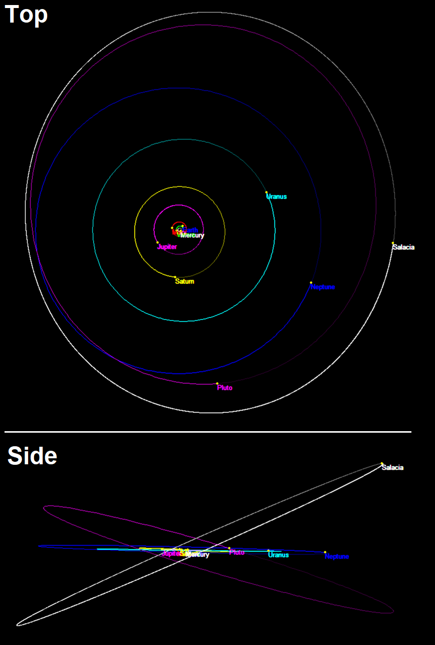 살라키아의 궤도는 명왕성과 유사하지만, 승교점 경도가 거의 반대이다. 현재 위치는 황도면 위에서 가장 북쪽 위치에 가깝다.