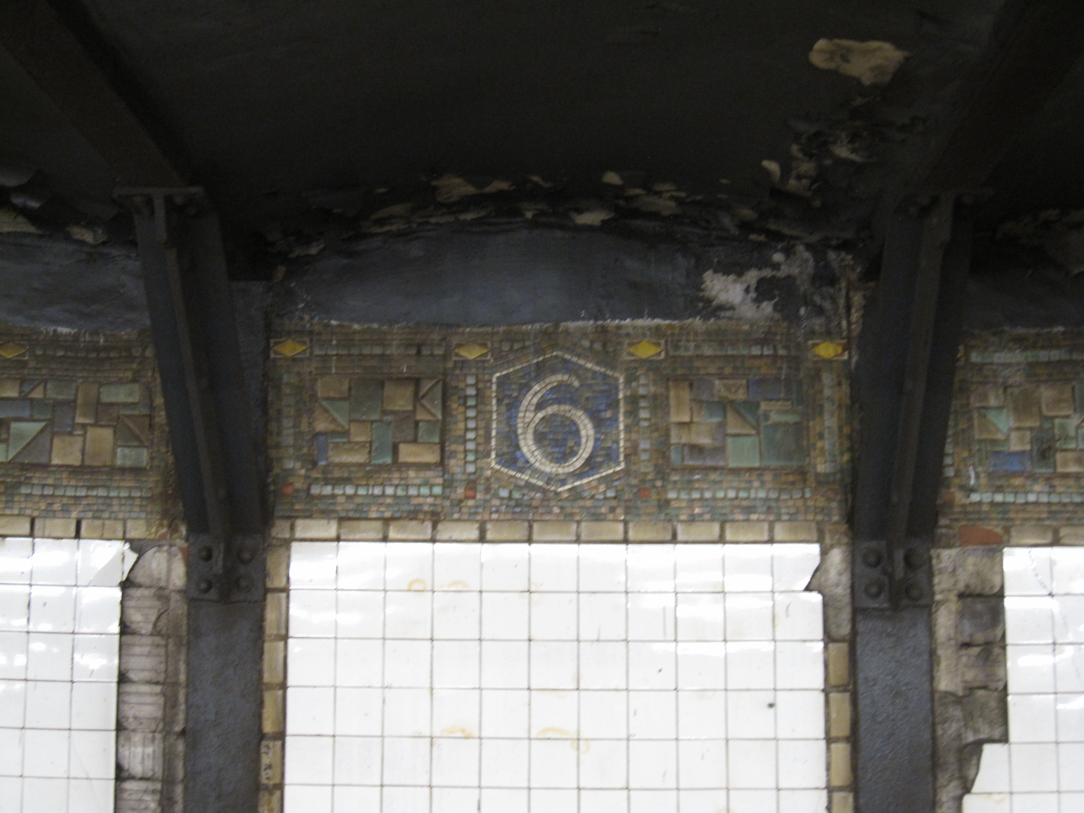 승강장 벽면에는 "14"라고 적힌 모자이크 타일 장식이 있다. 두 승강장 모두 파란색 I-빔 기둥이 일정 간격으로 양면에 배치되어 있으며, 기둥에는 번갈아 가며 표준 검은색 역명판에 흰색 글자로 역명이 새겨져 있다.