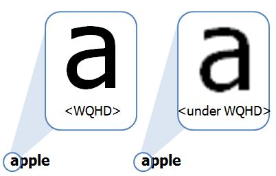 WQHD급의 고해상도 디스플레이는 많은 화소 수를 가지고 있기 때문에 문자 표현력이 뛰어나다. 흰 바탕에 검은색으로 문자를 입력했을 때, 문자와 배경 사이의 경계 강도[27]가 FHD보다 뚜렷하게 나타난다. 따라서 E-book, 웹사이트 등 문자 사용량이 많은 모바일 기기에서 고해상도 특성이 더 뚜렷하게 나타나며 사용자가 눈의 피로를 적게 느끼게 해준다.