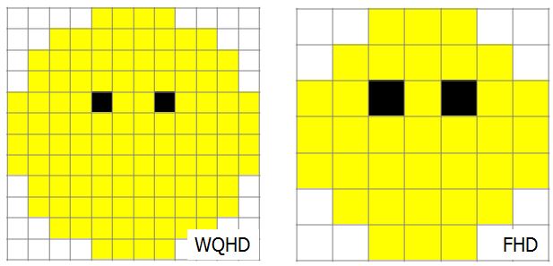 5인치 모바일 기기 기준으로, 2560개의 가로 픽셀 한 줄의 폭이 머리카락(10µm)보다 좁다. 이렇게 미세 단위의 정교한 묘사가 가능하기 때문에 화면 속 그림의 선명도가 높아진다. 특히 그림의 경계면에서 HD급보다 분명한 구분이 가능하다.