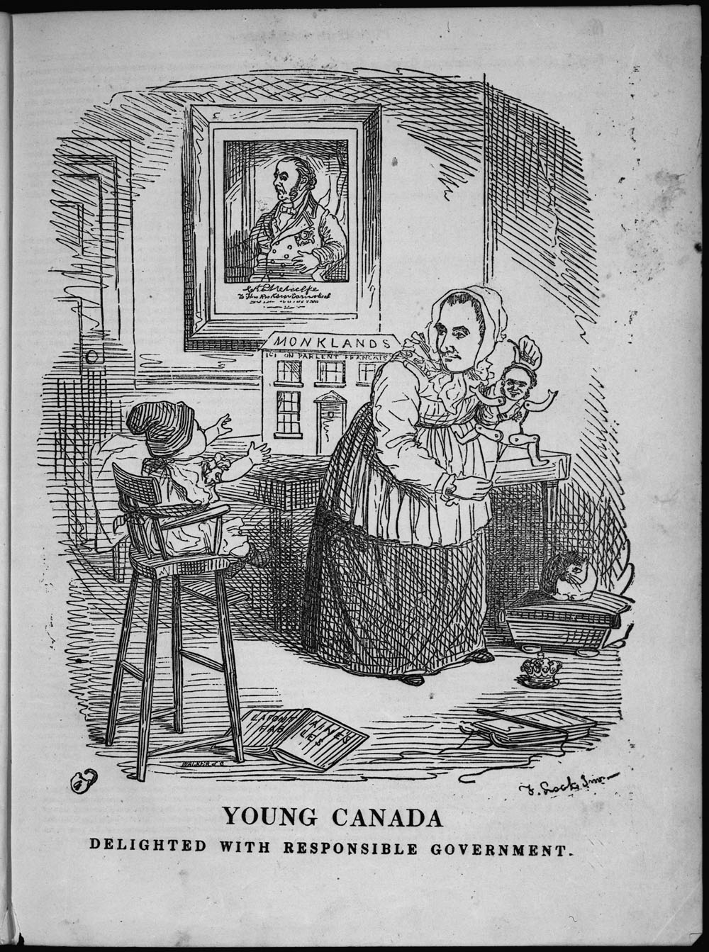 1849년 ''펀치'' 정치 만화는 아기 캐나다가 "책임 정부에 기뻐하는" 모습을 묘사한다. 책임 정부의 설립은 반란에 대한 보고서에서 권고되었다.