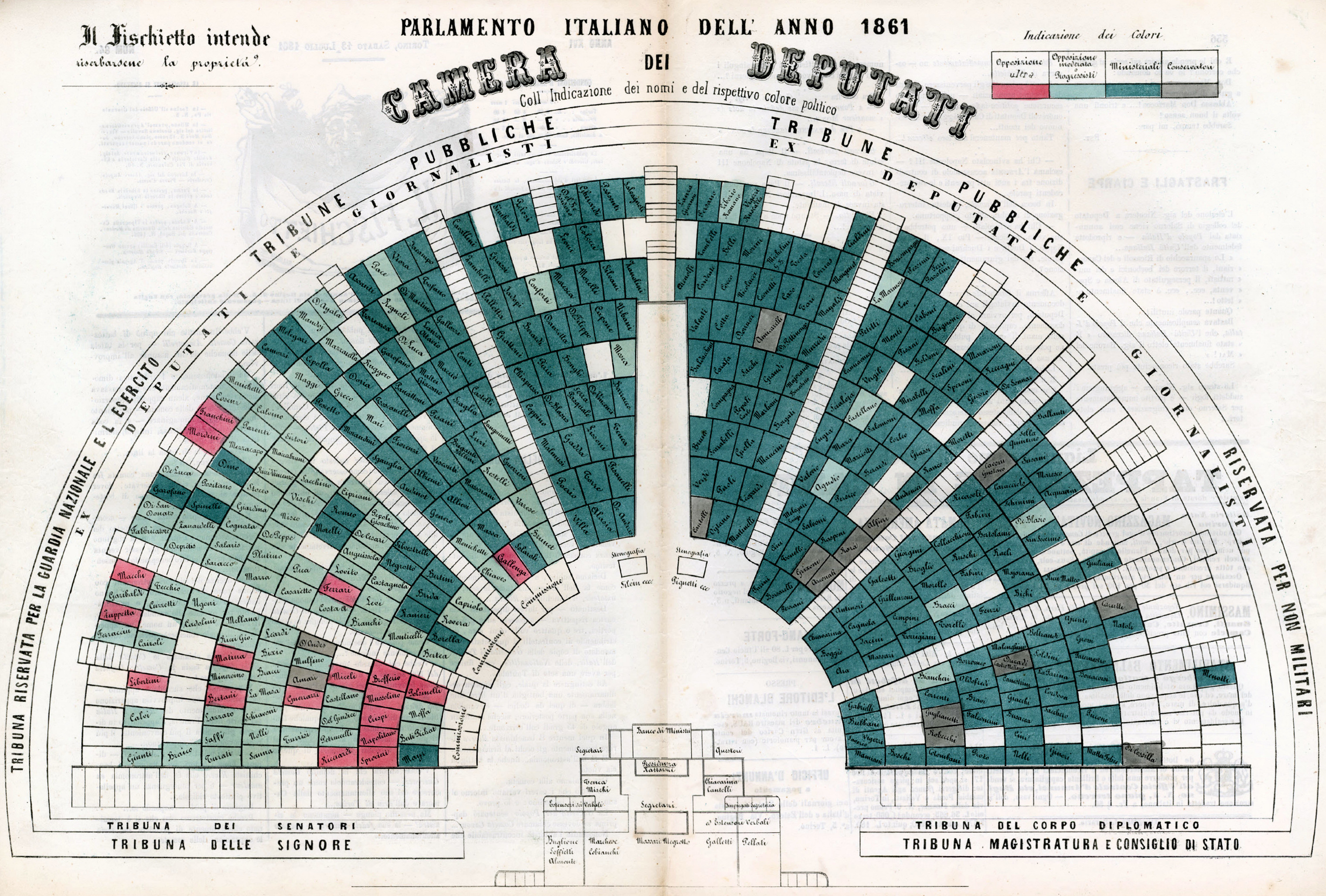 1861년 《피시에토》지에 소개된 의원 성향별 이탈리아 하원 구성