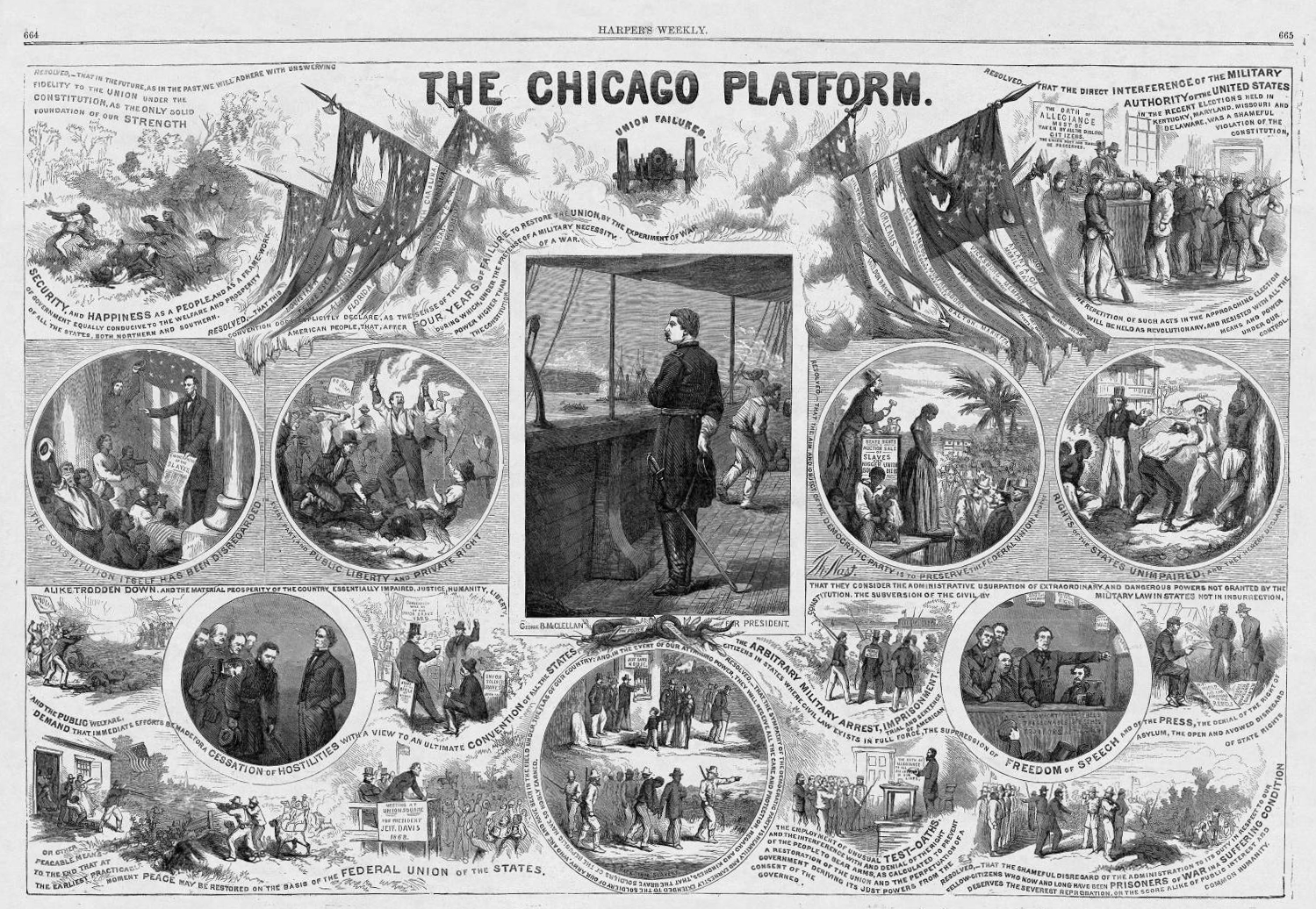 민주당은 전쟁과 평화 문제로 분열되었으며, 친전쟁 장군 조지 B. 맥클레런을 대통령 후보로, 반전 하원의원 조지 H. 펜들턴을 부통령 후보로 지명하는 타협안을 채택했다.[14] 전당대회는 평화 플랫폼을 채택했지만,[15] 맥클레런은 개인적으로 이를 거부했다.[16]