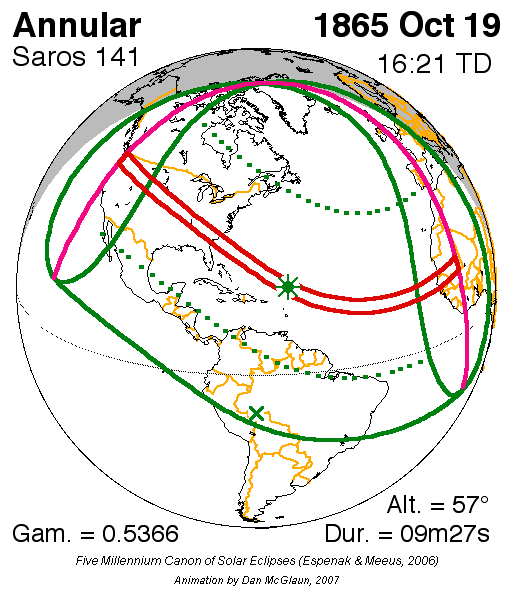 1865년 10월 19일 금환![]() | 사로스 141 감마 0.5366 | 1866년 4월 15일 부분![]() | 사로스 146 감마 −1.1846 |