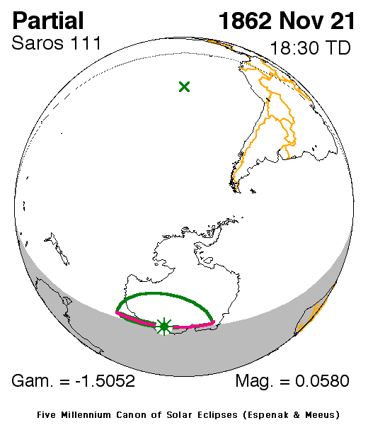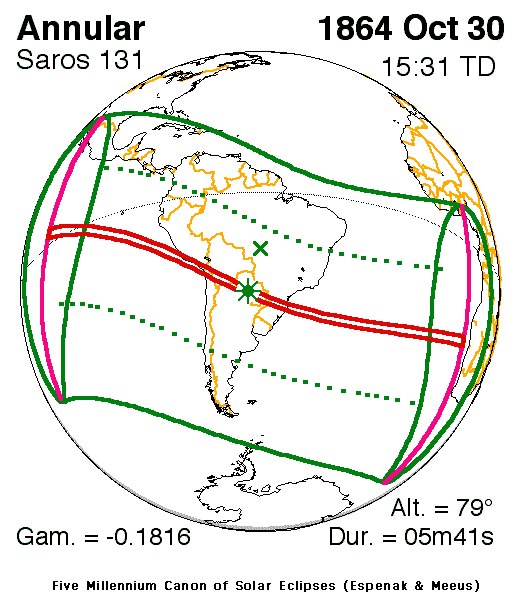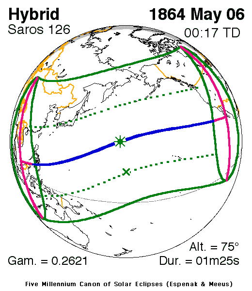 1863년 11월 11일 금환![]() | 사로스 121 감마 −0.8760 | 1864년 5월 6일 혼합![]() | 사로스 126 감마 0.2622 |