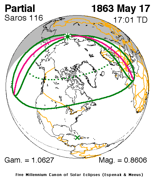 1862년 11월 21일 부분![]() | 사로스 111 감마 −1.5052 | 1863년 5월 17일 부분![]() | 사로스 116 감마 1.0627 |