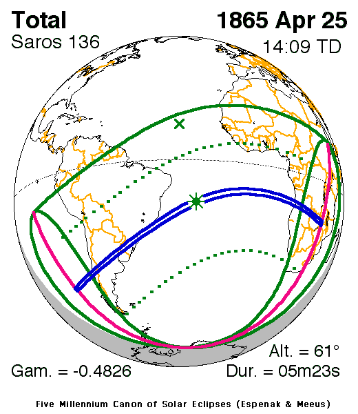1865년 4월 25일에 발생한 일식의 상세 정보는 다음과 같다.[3]