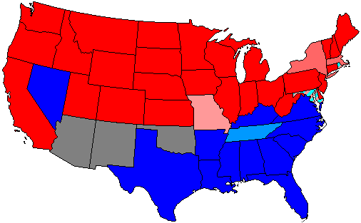 주별 하원 의석 분포를 보면, 대부분의 주에서 공화당 또는 민주당 중 한 정당이 다수를 차지했다. 정당별 의석 수 변동을 보면, 공화당은 대부분의 주에서 의석을 늘렸고, 민주당은 의석을 잃었다.주 총 의석수 공화당 민주당 의석 변동 의석 변동 앨라배마 9 0 9 아칸소 7 0 7 캘리포니아 8 8 3 0 3 콜로라도 3 3 1 0 코네티컷 5 5 0 델라웨어 1 1 1 0 1 플로리다 3 0 3 조지아 11 0 11 아이다호 1 1 0 일리노이 25 24 7 1 7 인디애나 13 11 2 2 2 아이오와 11 11 1 0 캔자스 8 8 0 켄터키 11 2 1 9 1 루이지애나 7 0 7 메인 4 4 0 메릴랜드 6 3 1 3 1 매사추세츠 14 11 1 3 1 미시간 12 12 1 0 1 미네소타 9 9 1 0 1 미시시피 8 0 8 미주리 16 10 9 6 9 몬태나 1 1 0 네브래스카 6 6 1 0 1 네바다 1 0 1 뉴햄프셔 2 2 0 뉴저지 10 9 2 1 2 뉴욕 37 26 6 11 6 노스캐롤라이나 10 1 1 9 1 노스다코타 2 2 0 오하이오 21 20 3 1 3 오리건 2 2 0 펜실베이니아 32 31 3 1 3 로드아일랜드 2 1 1 사우스캐롤라이나 7 0 7 사우스다코타 2 2 0 테네시 10 2 8 텍사스 16 0 16 유타 1 1 0 버몬트 2 2 0 버지니아 10 1 9 워싱턴 3 3 0 웨스트버지니아 5 5 0 위스콘신 11 10 1 와이오밍 1 1 0 합계 386 251 41 135 41