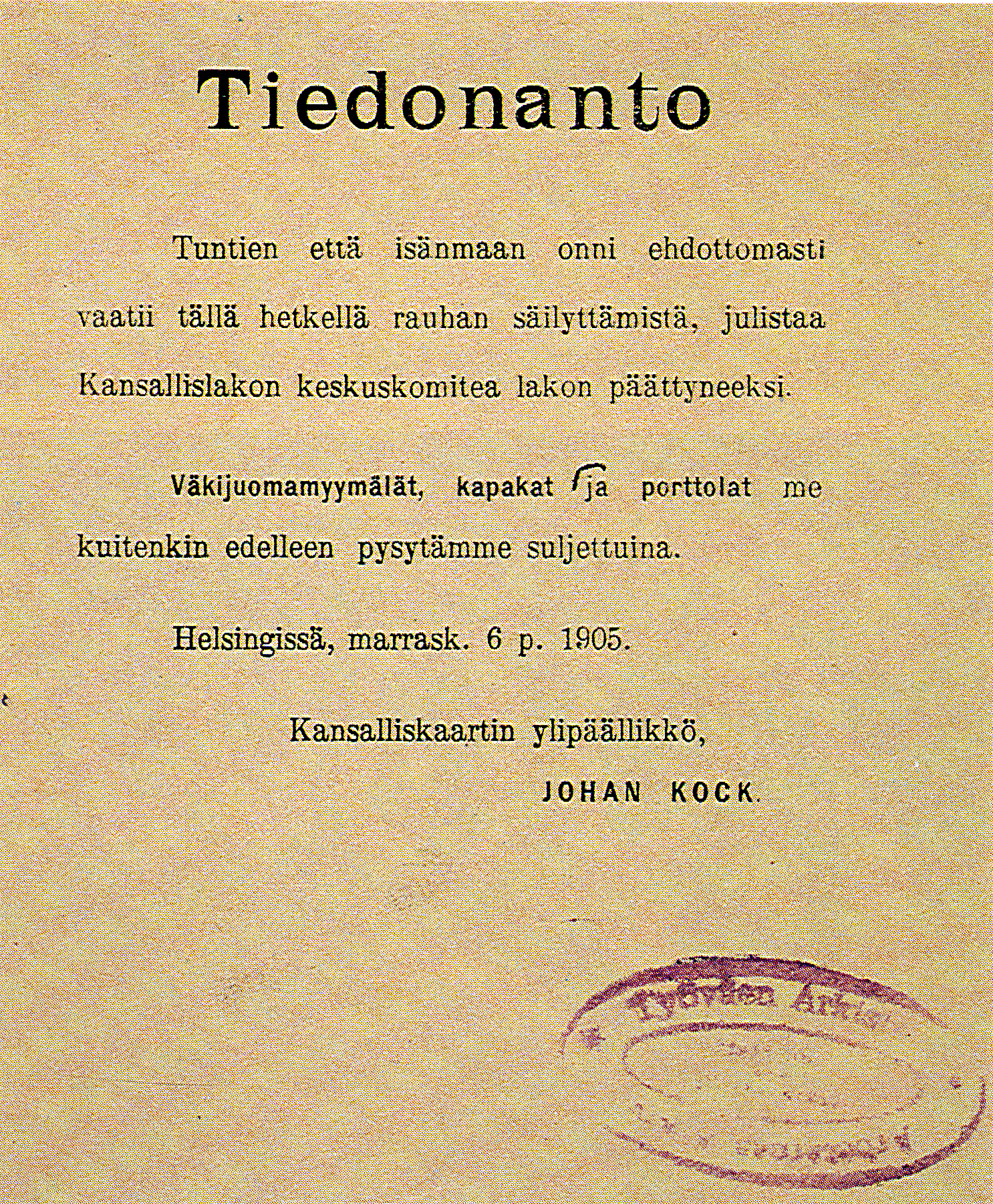 1905년 10월 29일-30일 핀란드 대공국에서 총파업이 시작되었다.[1][2][3][4][5][6] 헬싱키의 원로원 광장, 철도광장과 탐페레의 장터광장(오늘날의 탐페레 중앙광장)에 거대한 시위 인파가 모였고, 노동자 뿐 아니라 문·이과 대학생들도 시위에 동참했다.[1][2][3][4][5][6] 공장, 가게, 학교들은 문을 닫았고 핀란드인들은 거리와 광장으로 나와 모였다.[1][2][3][4][5][6] 핀란드 대공국의 태생적 한계상 전국적으로 조직적인 행동은 어려웠고, 각 지역별 자율적인 움직임들이 이루어졌다.[1][2][3][4][5][6] 헬싱키, 탐페레, 비푸리가 주도적인 지역들이었으며, 북포흐얀마 지역의 오울루에서도 파업이 활발했다.[1][2][3][4][5][6] 투르쿠-비푸리-오울루를 잇는 거대한 삼각형 안의 지역은 거의 농촌지역에 기독교의 영향이 강한 곳으로, 이 일대의 촌락들과 소도시들에서는 파업 동참 정도가 달랐다.[1][2][3][4][5][6]