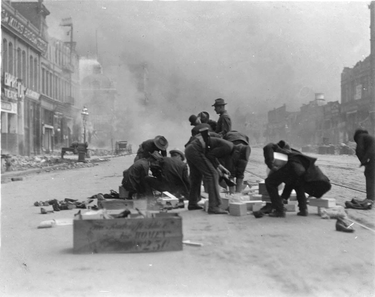 4월 18일, 피난민들 사이의 폭동과 약탈에 대응하여 슈미츠 시장은 "연방군, 정규 경찰 및 모든 특별 경찰관은 약탈 또는 기타 범죄를 저지르는 모든 사람을 사살하도록 저에게 권한을 부여받았습니다."라는 포고문을 발표하고 게시했다.[45] 군인들의 약탈 행위에 대한 비난도 제기되었다.[46] 22연대 보병의 퇴역 대위 에드워드 오드는 슈미츠에 의해 특별 경찰관으로 임명되었고, 비상 상황에 참여한 22연대 보병 및 기타 군 부대와 함께 구호 작업을 위해 그릴리와 연락을 취했다. 오드는 나중에 슈미츠의 "사살 명령"과 약탈을 한 22연대 보병의 특정 군인들의 "비열한" 행동에 대해 4월 20일 어머니에게 긴 편지[47]를 썼다. 그는 또한 대다수의 군인들이 지역 사회에 봉사했다는 점을 분명히 했다.[46]