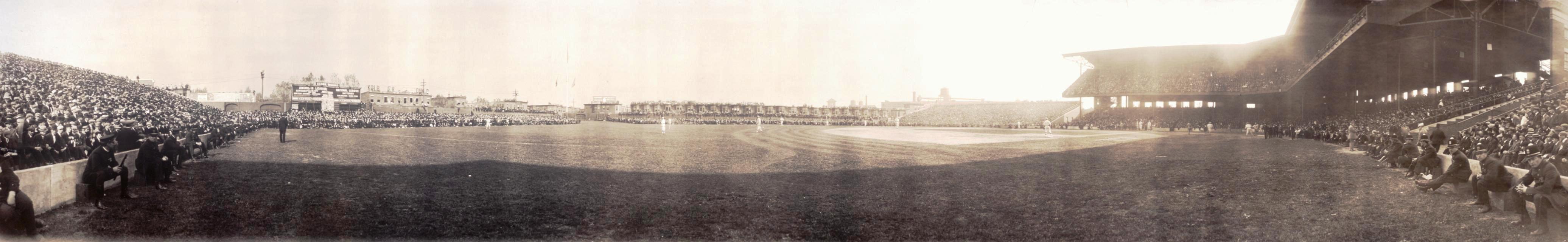 1910년 10월 17일 월요일, 펜실베이니아주 필라델피아 쉬브 파크에서 열린 1차전에서 필라델피아 애슬레틱스가 시카고 컵스를 4-1로 이겼다.