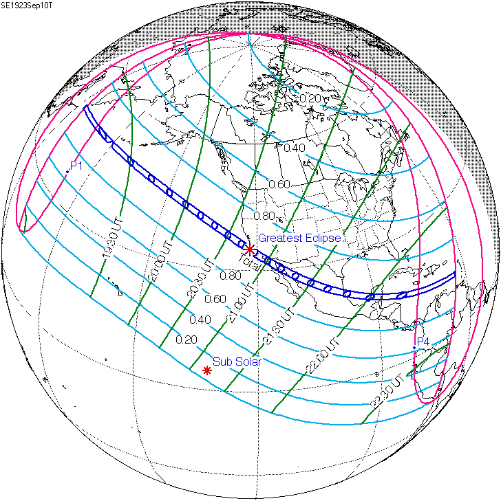 1923년 9월 10일 일식에 대한 세부 정보는 다음과 같다.[5]