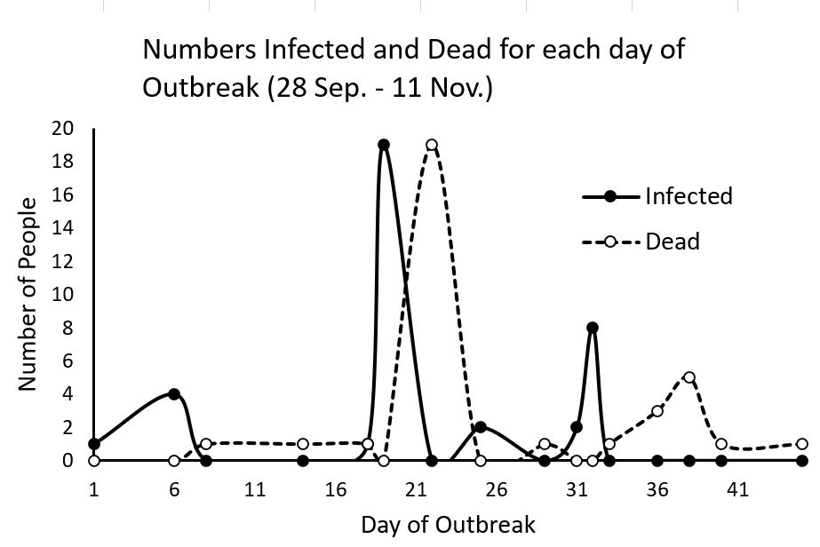프란시스카는 일주일 후 사망했다. 그녀를 돌보던 이웃이자 임산부였던 루세나 사마라노(Lucena Samarano)도 유사한 호흡기 증상을 보이다 며칠 후 사망했다. 사마라노의 장례 미사에 참석했던 가톨릭 신부 M. 브루알라(Brualla)와 여러 이웃들도 같은 증상을 보이다 며칠 후 사망했다. 일주일도 지나지 않아 루세나 사마라노의 가족 8명이 모두 사망했다.[74][78]