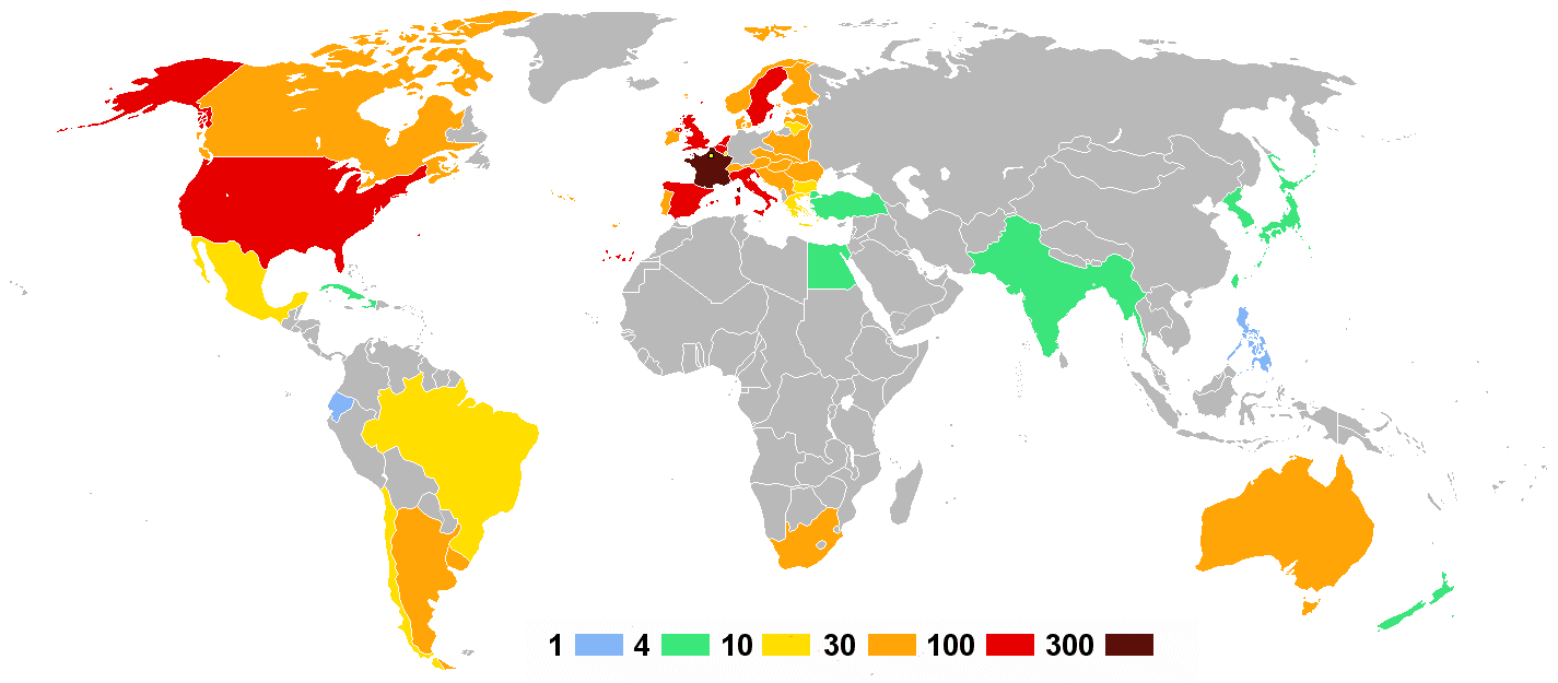 프랑스 (401) (개최국) | 영국 (267) | 그리스 (26) | 아이티 (8) | 헝가리 (89) |