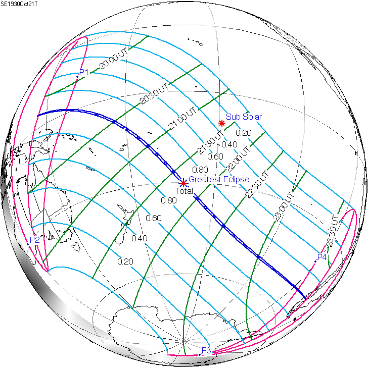 1930년 10월 21일에 발생한 일식의 상세 정보는 다음과 같다. 이 일식과 관련된 다양한 매개변수는 하위 섹션 "일식 매개변수"에 표로 정리되어 있으며, 일식 시간 정보는 "일식 시간" 하위 섹션에 표로 정리되어 있다.[3]