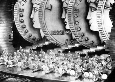 - "잊혀진 나의 사람을 기억하라(Remember My Forgotten Man)"는 조안 블론델이 공연하며, 에타 모튼이 특별 보컬 솔로를 맡았고, 이 장면의 마지막 부분에서 블론델의 노래 목소리를 더빙하기도 했다.[17] 독일 표현주의의 영향을 받은 세트와 대공황 시대의 빈곤을 생생하게 묘사한다. 버클리는 1932년 5월 보너스 군의 워싱턴 D.C. 행진과 같은 해 FDR의 "잊혀진 사람"에 대한 연설에서 영감을 받았다.[18] 잭 L. 워너와 대릴 F. 재넉(스튜디오 제작 책임자)은 이 장면이 완성되자 깊은 감명을 받아 "공원에서 애무하기"를 대체하여 영화의 마지막 부분으로 옮기라고 명령했다.[16]