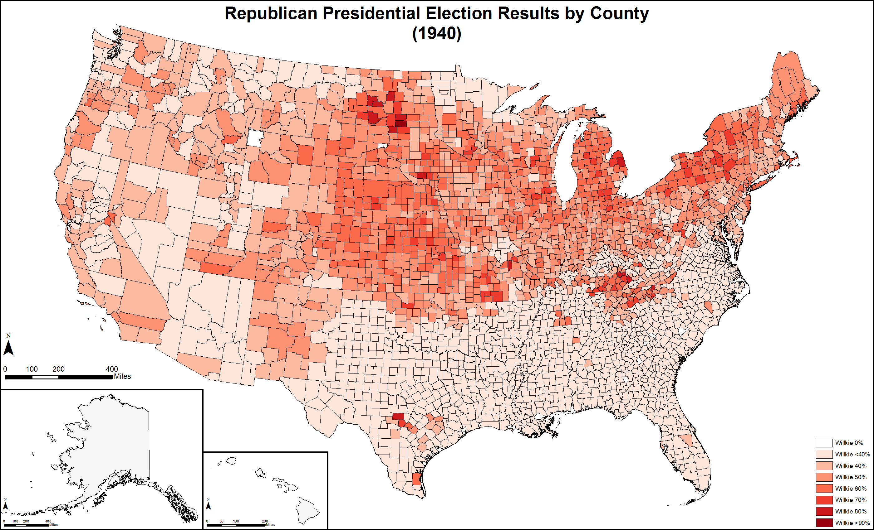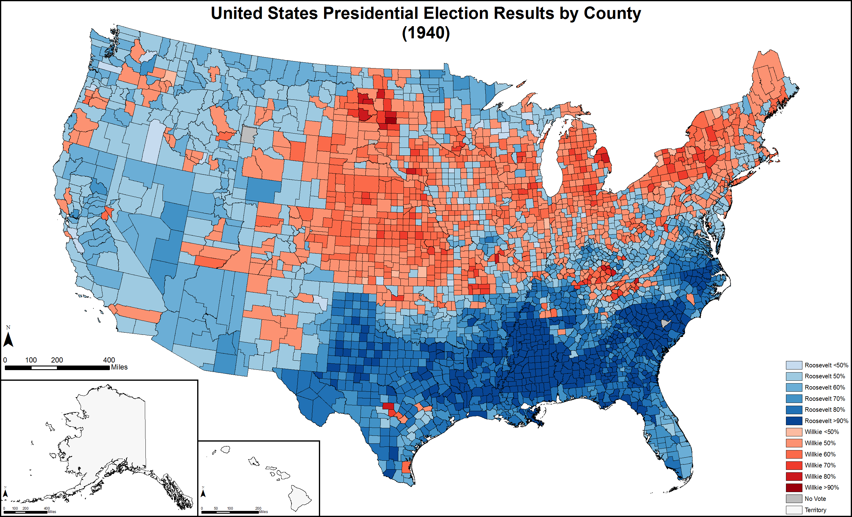 1940년 미국 대통령 선거에서 민주당의 프랭클린 D. 루스벨트 대통령은 3선에 도전하여 공화당의 웬델 윌키를 꺾고 승리했다. 루스벨트는 압도적인 지지로 민주당 후보로 선출되었으며, 헨리 A. 월러스를 부통령 후보로 지명했다. 공화당은 제2차 세계 대전에 대한 개입 여부를 두고 분열되었으며, 윌키는 다크호스 후보로 등장하여 공화당 후보로 지명되었다. 선거 과정에서 루스벨트는 전쟁에 대한 우려를 불식시키고, 윌키는 뉴딜 정책을 비판했지만, 루스벨트의 압승으로 끝났다. 루스벨트는 전체 유권자 투표에서 54.7%를 득표하여 449명의 선거인단을 확보했고, 윌키는 44.8%를 득표하여 82명의 선거인단을 얻었다.