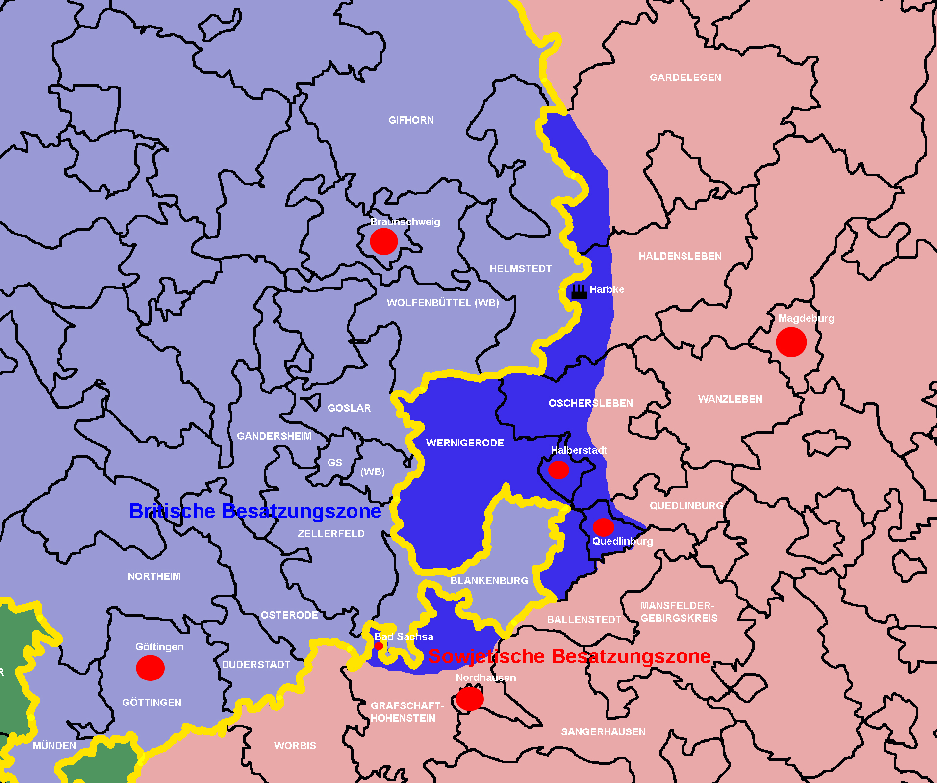 1945년 7월 10일부터 영국과 소련 간 영토 교환 협상이 시작되었다. 이 합의는 블랑켄부르크 지역의 약 30,000명과 그라프샤프트 호엔슈타인군에서 바트 작사 및 테텐보른의 6,000명에게 영향을 주었다. 영국과 소련은 대량 인구 유출을 막기 위해 영토 교환을 공개하지 않았다.[12]