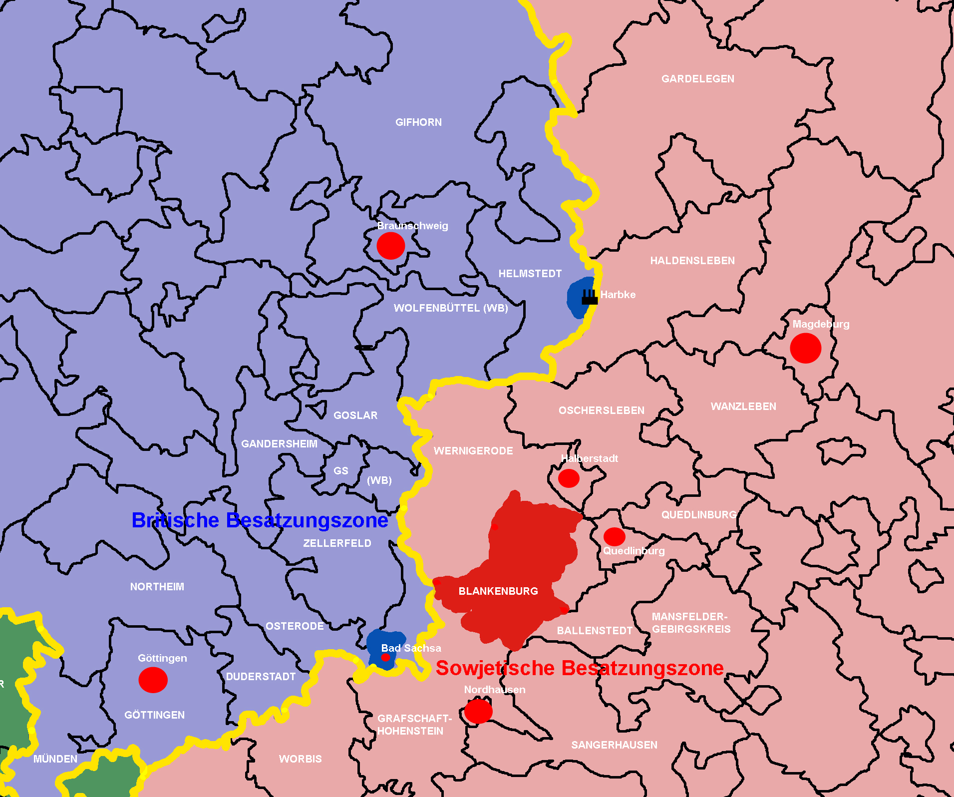 1945년 7월 10일부터 영국과 소련 간 영토 교환 협상이 시작되었다. 이 합의는 블랑켄부르크 지역의 약 30,000명과 그라프샤프트 호엔슈타인군에서 바트 작사 및 테텐보른의 6,000명에게 영향을 주었다. 영국과 소련은 대량 인구 유출을 막기 위해 영토 교환을 공개하지 않았다.[12]