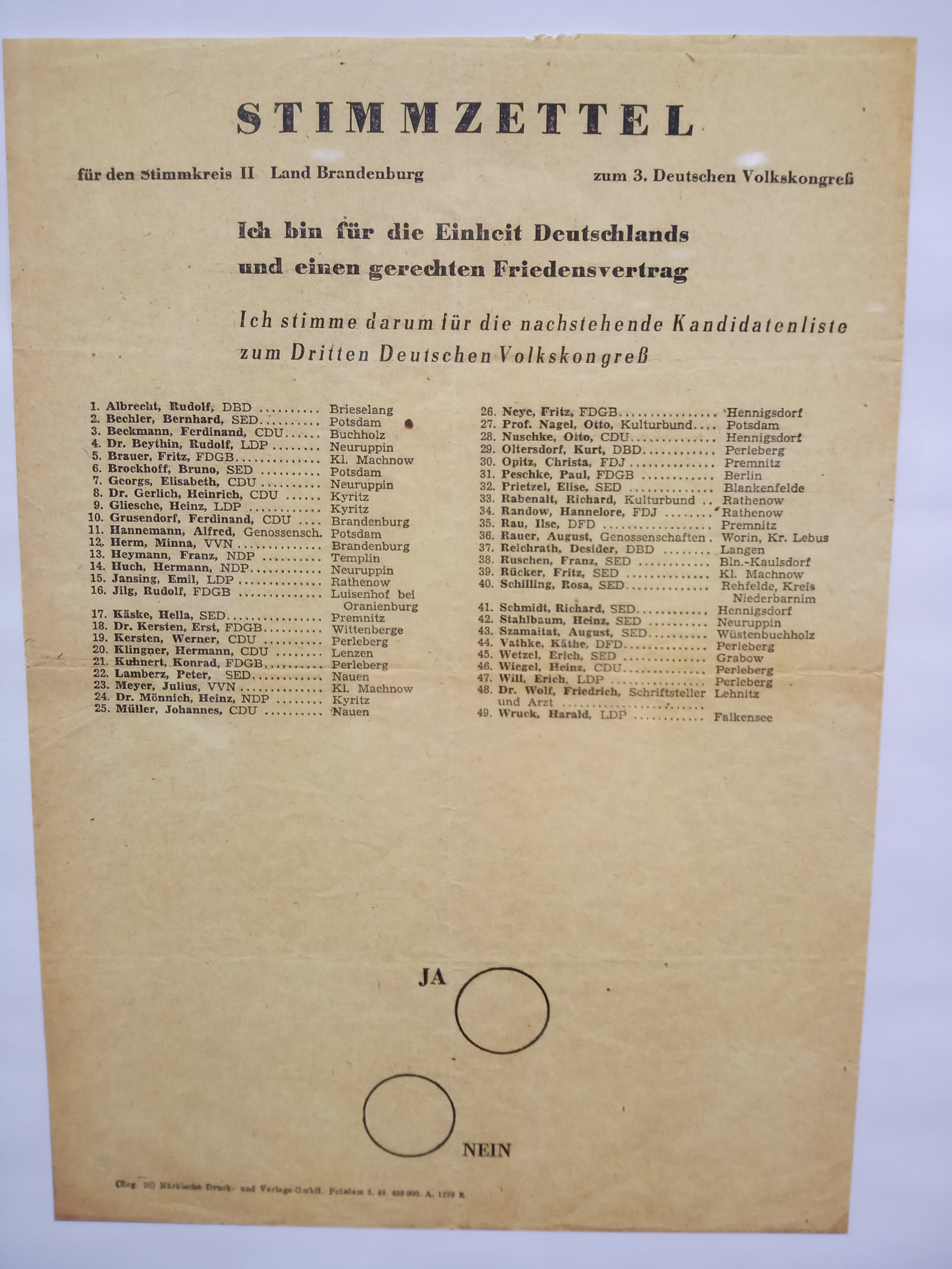 1949년 동독 총선거에서 반파시스트민주정당연맹은 66.1%를 득표했고, 반대표는 33.9%가 나왔다.