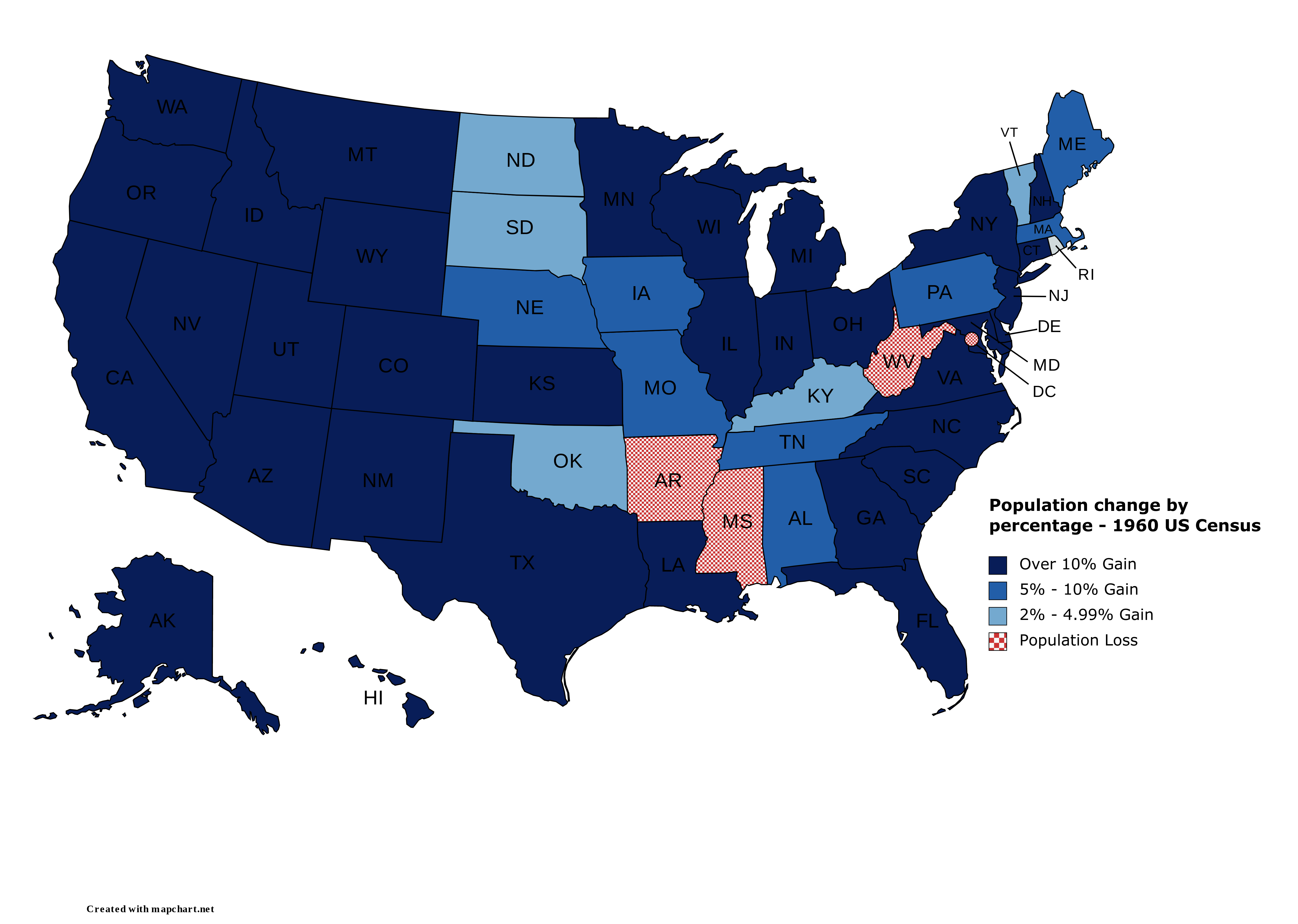 1960년 미국 인구 조사에 따르면, 1950년 인구 조사 당시 151,325,798명이었던 미국 인구는 179,323,175명으로 증가했다. 각 주별 인구 순위는 다음과 같다.