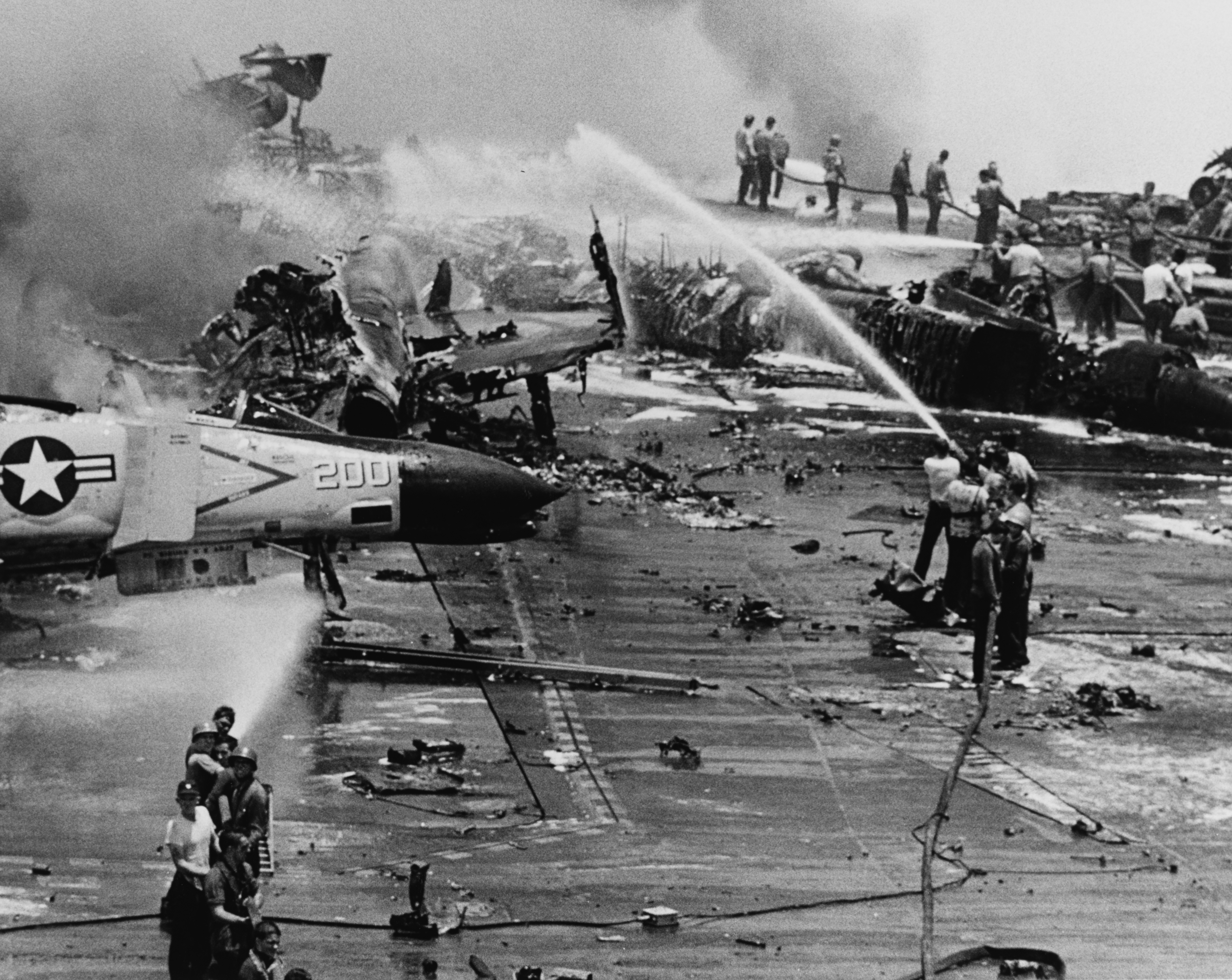 화재로 134명이 사망하고 161명이 부상당했다.[34][2] F-4B 팬텀 II 7대, A-4E 스카이호크 11대, RA-5C 비질란테 3대 등 총 21대의 항공기가 파괴되었고,[1] 40대가 추가로 손상되었다.[35]