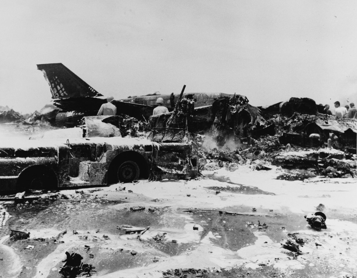 당시 비행 갑판은 12대의 A-4E 스카이호크, 7대의 F-4B 팬텀 II, 2대의 RA-5C 비질란테 항공기 등 총 27대의 항공기로 빽빽하게 채워져 있었고, 이들 항공기는 폭탄, 로켓, 탄약 및 연료로 완전히 무장한 상태였다.[16] 특히, VF-11 소속 F-4B 팬텀 II (No. 110, 국방부 번호 153061)는 LAU-10 윙 언더 로켓 포드를 장착하고 있었는데, 각 포드에는 4개의 비유도 약 12.70cm Mk-32 "주니" 로켓이 들어 있었다.[1]