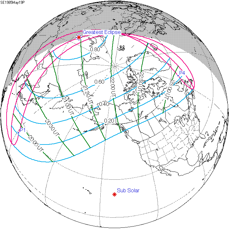 1985년 5월 19일에 부분 일식이 발생했다. 이 일식에 대한 상세 정보는 다음과 같다.[2]